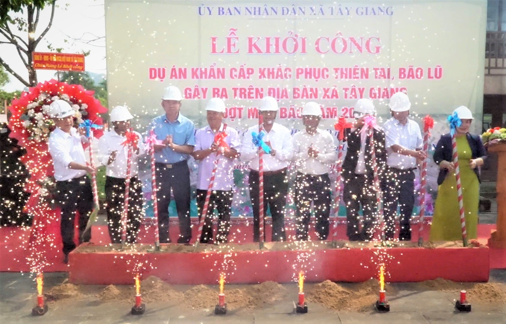 Lãnh đạo xã Tây Giang thực hiện nghi thức khởi công các dự án. Ảnh: THƯ NHÃ