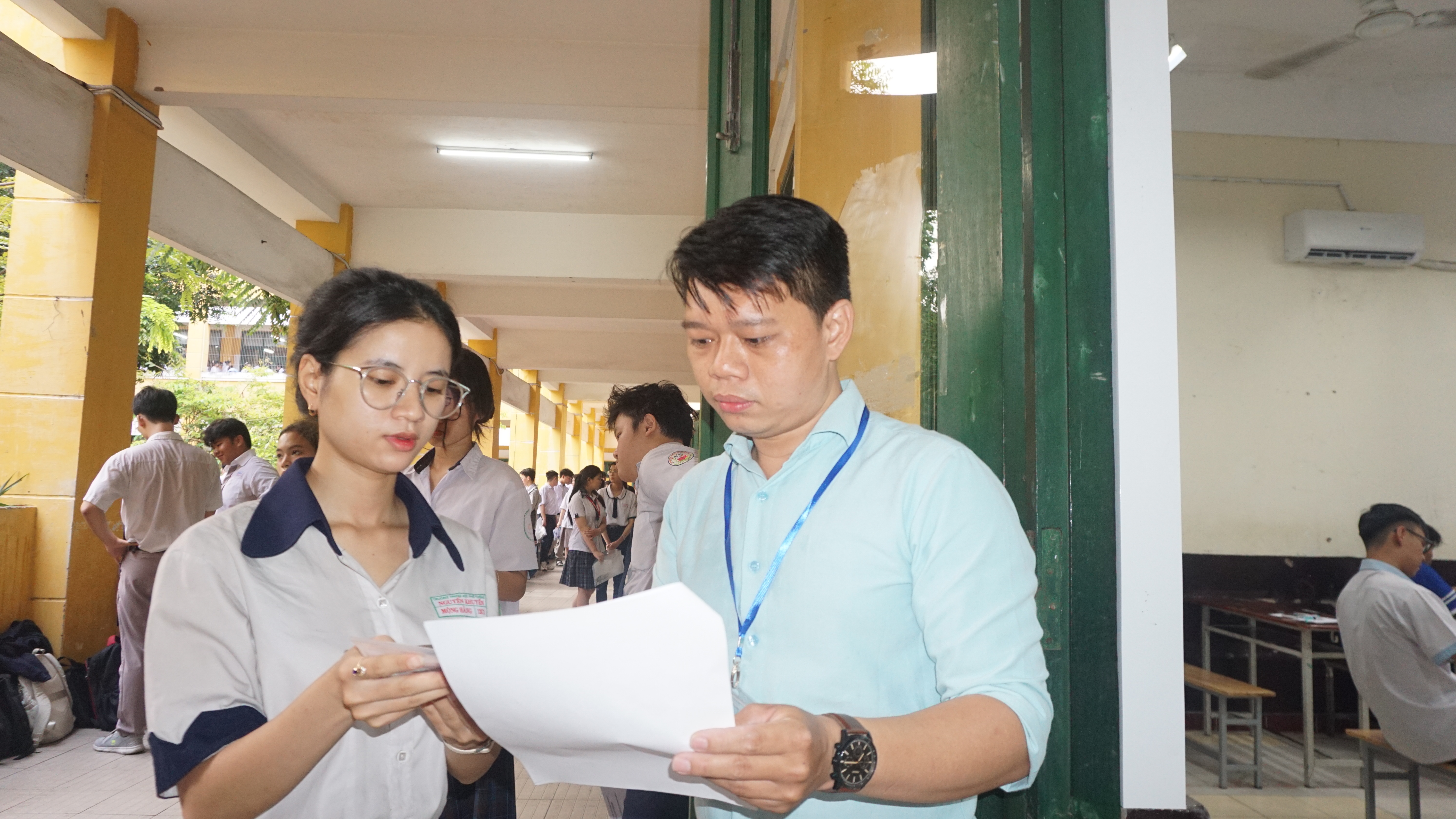 Giám thị phát giấy nháp cho thí sinh. Ảnh: NGUYỄN QUYÊN