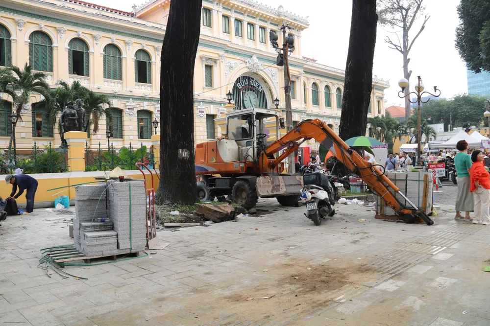 Những ngày cuối năm, đường phố TP.HCM rộn ràng hơn khi khắp các tuyến phố, vỉa hè chuẩn bị được "thay áo mới" cho khang trang. Ghi nhận của PLO cho thấy, tại khu vực phía trước Bưu điện TP, Công trường công xã Paris, Đường sách TP.HCM, công nhân và máy móc đang thi công nhộn nhịp để hoàn thiện những công đoạn cuối cùng.
