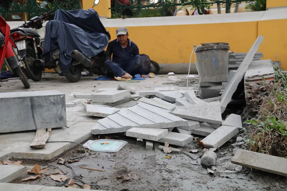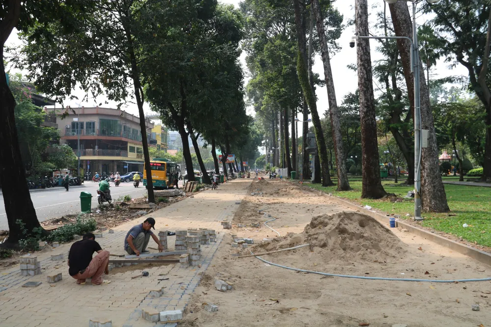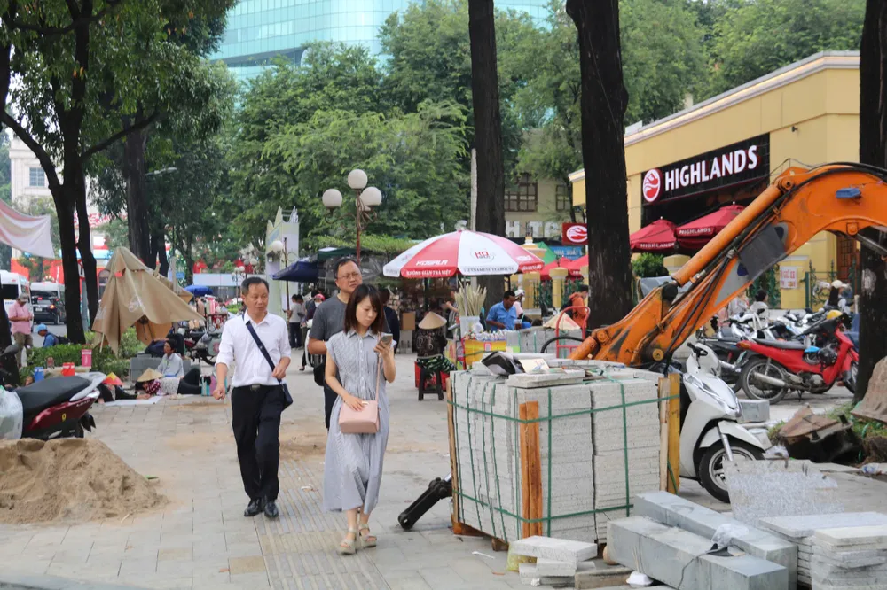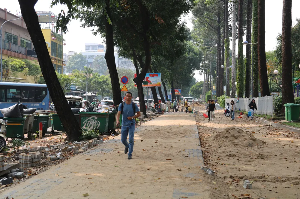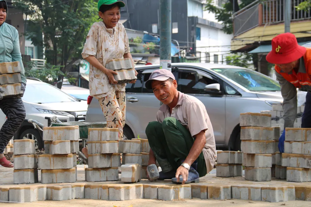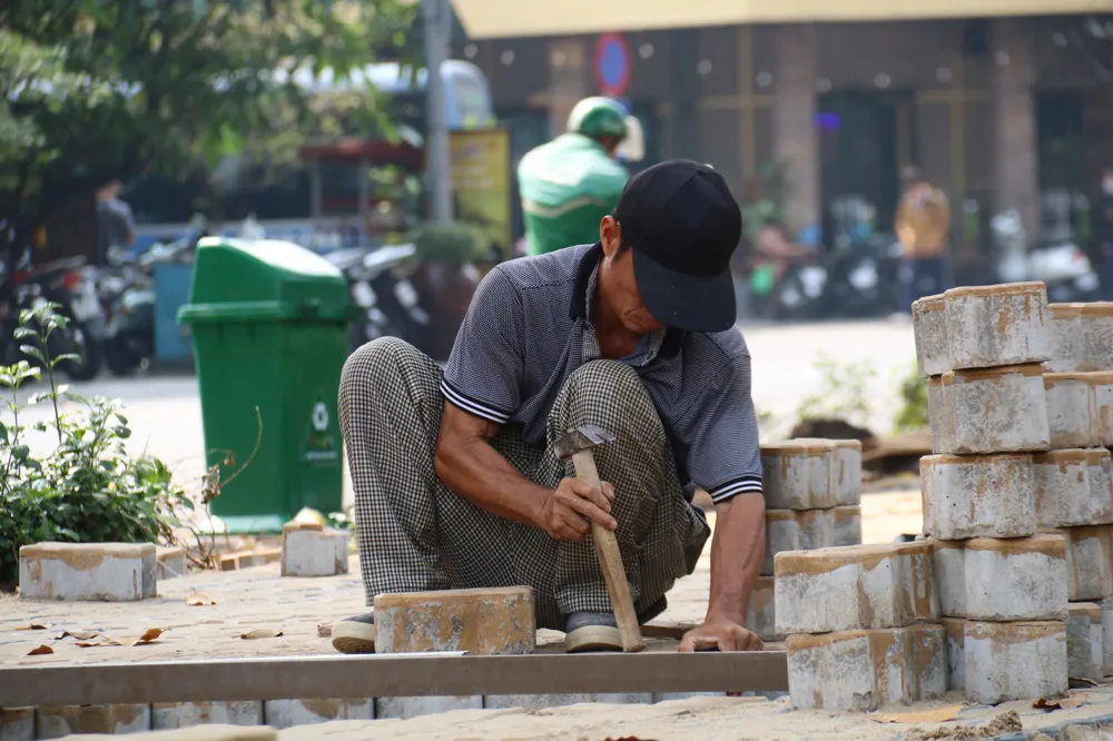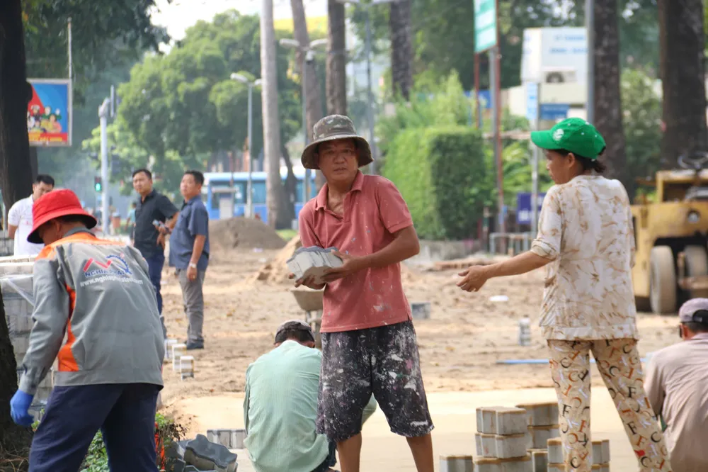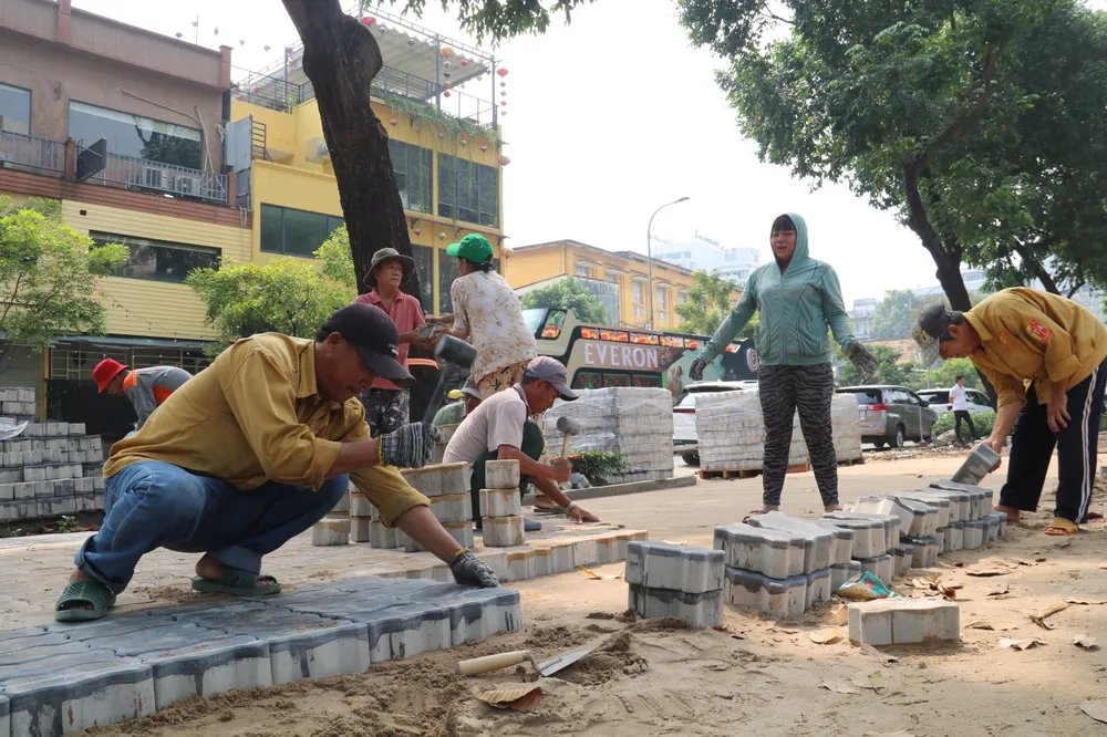 Đáng chú ý, tại đường Phạm Ngũ Lão, đoạn sát Công viên 23/9, một dải vỉa hè dài hàng trăm mét đang được lát mới bằng những viên gạch hình con sâu. Hàng chục công nhân miệt mài làm việc, tất bật san lấp, đo đạc, sắp gạch, mang đến bầu không khí lao động khẩn trương.