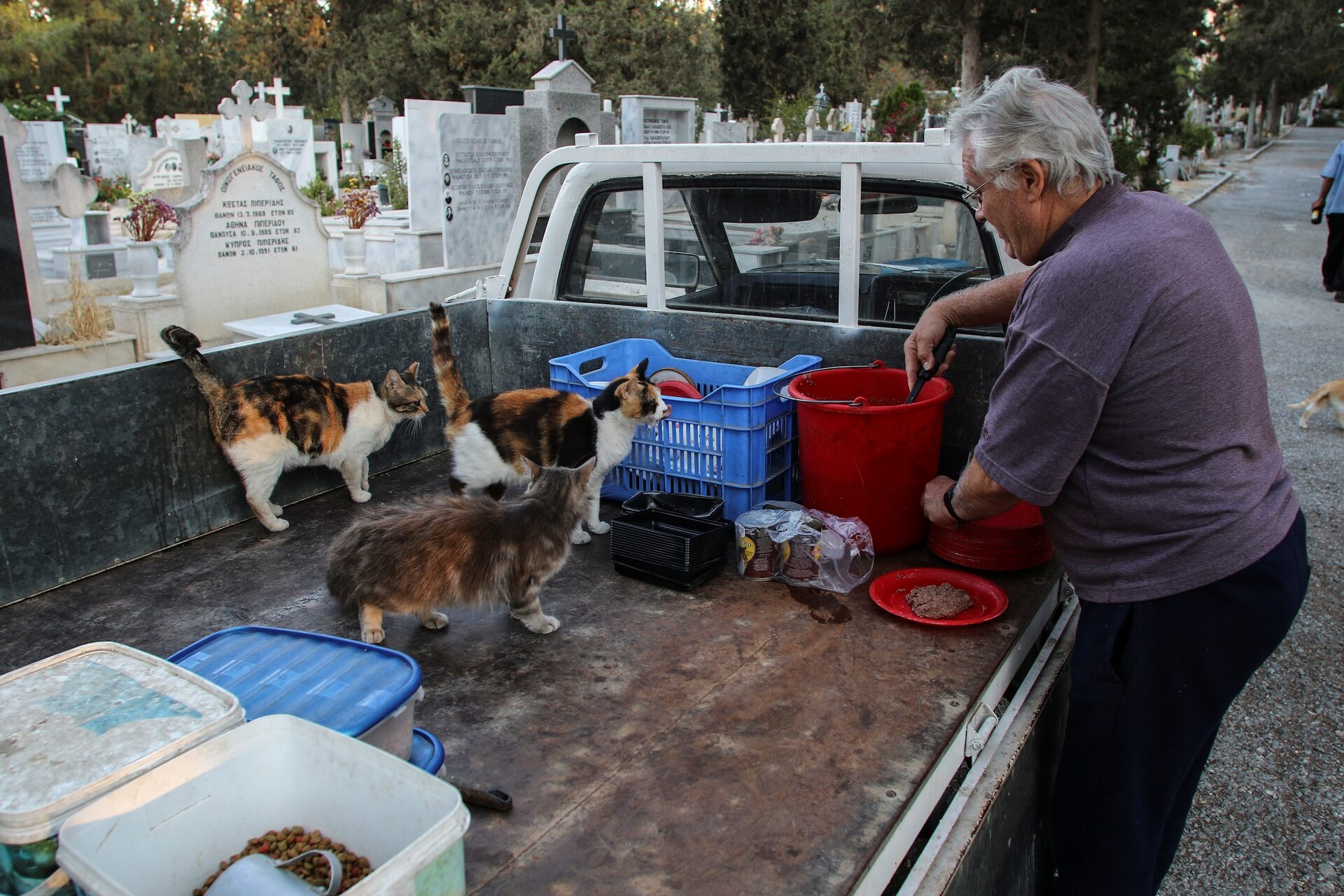 Tình nguyện viên chuẩn bị thức ăn cho mèo hoang tại một nghĩa trang ở Nicosia, Cyprus, năm 2021. Ảnh: Reuters.