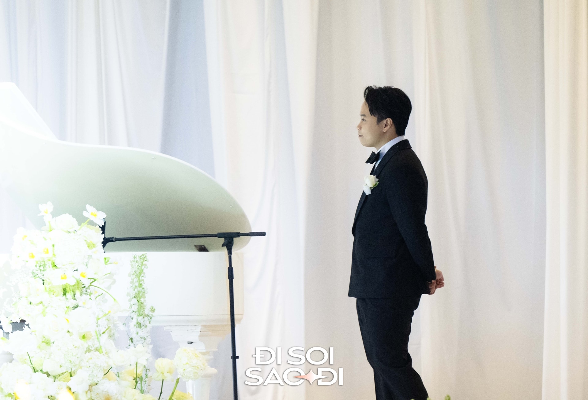 Điểm nhấn của sân khấu là tháp bánh cưới lớn mang tên viết tắt của cô dâu chú rể và một cây đàn piano được bài trí sẵn sàng. Lối vào lễ đường cũng được phủ kín hoa tươi, thể hiện sự đầu tư và tâm huyết của cặp đôi cho ngày trọng đại.