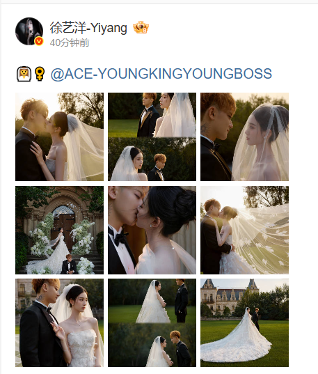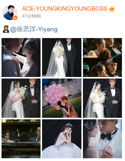 Chiều 15/10, và đồng loạt đăng tải ảnh cưới trên Weibo. Từ Nghệ Dương thống nhất concept, chỉ đăng hình diện cùng một lễ phục được chụp ở khuôn viên một căn biệt thự. Hoàng Tử Thao khiến fan bật cười khi "có nhiêu đăng hết", khoe đủ tạo hình của hai người và không quên đính kèm ảnh riêng của bà xã.