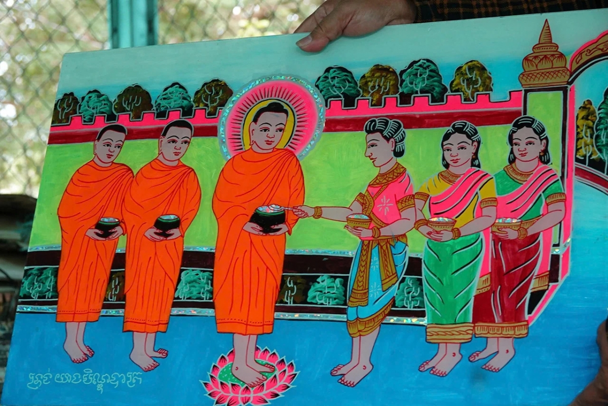 “Trước đây, dân làng từ già tới trẻ nhỏ đều biết vẽ tranh nên hình thành làng nghề truyền thống này, nghề học từ ông bà để lại. Nghề vẽ tranh kiếng ở ấp Phước Thuận, phần lớn vẽ tranh về Đức Phật vì đồng bào dân tộc Khmer tôn sùng, kính trọng Đức Phật, nhà nào cũng phải có hình Đức Phật treo trên bàn thờ. Đức Phật vẽ theo mẫu truyền thống, có mẫu sẵn rồi mình cứ can lên, vẽ, tô lại.”