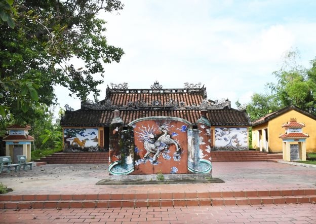Mái đình lợp ngói âm dương với nóc đắp “lưỡng long triều nguyệt”, hai đầu bít đốc trang trí hình dơi, mai điểu, tùng lộc, cùng kỹ thuật khảm sành sứ cầu kỳ. Trước sân là bức bình phong lớn, mặt trước chạm hình long mã, mặt sau là hình rùa, biểu tượng cho sự thịnh vượng và trường tồn.