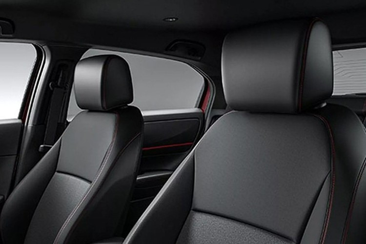Khoang nội thất của Honda HR-V e:HEV RS 2026 mới vẫn tiếp tục trung thành với phong cách RS: tông đen chủ đạo, chỉ khâu đỏ tương phản, vô lăng bọc da thật và ghế da lộn tạo cảm giác thể thao, cao cấp.