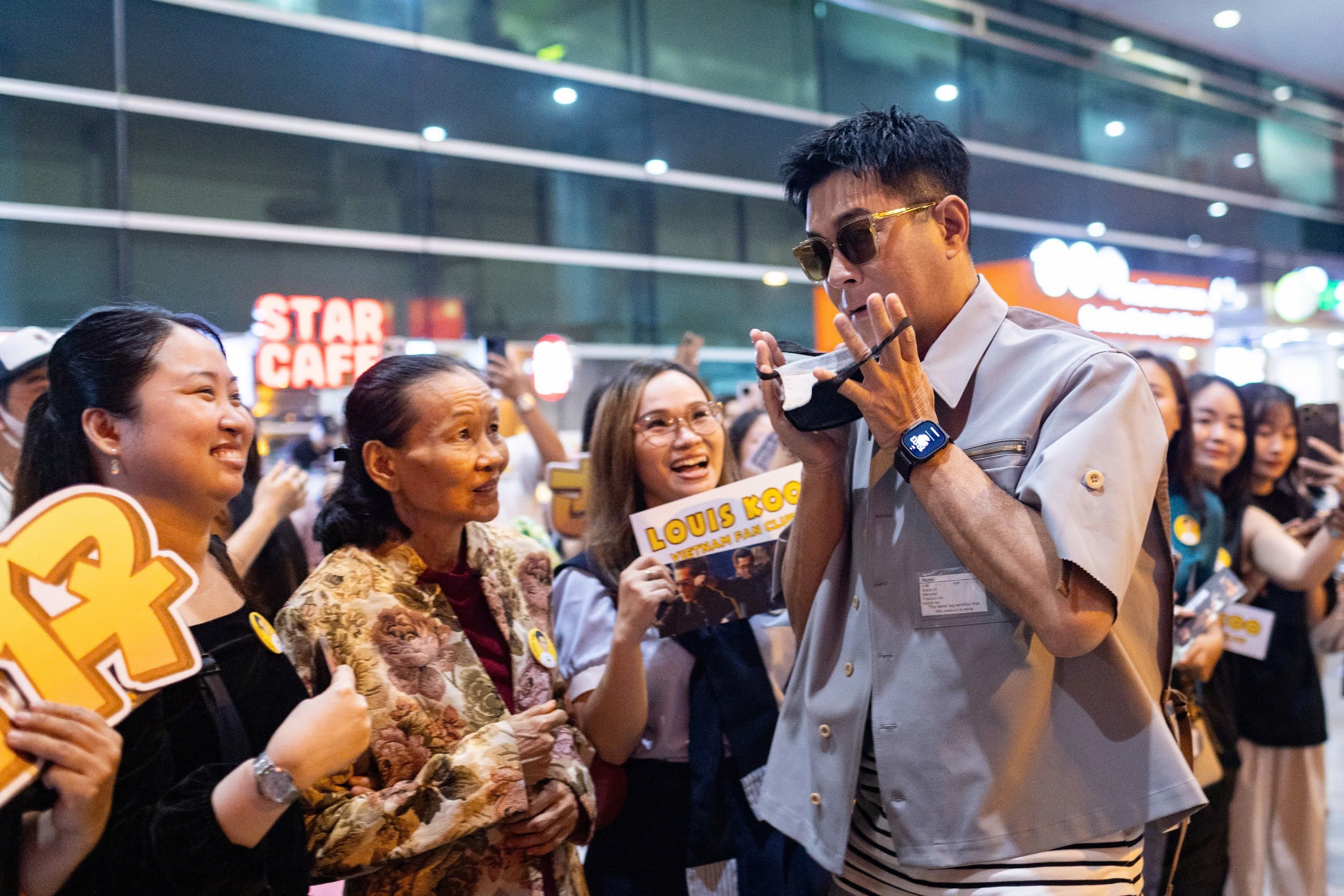 Nhà sản xuất, diễn viên Cổ Thiên Lạc đáp chuyến bay xuống sân bay Tân Sơn Nhất vào khoảng 19h. Anh rạng rỡ khi chụp hình lưu niệm với hơn 100 fan Việt.