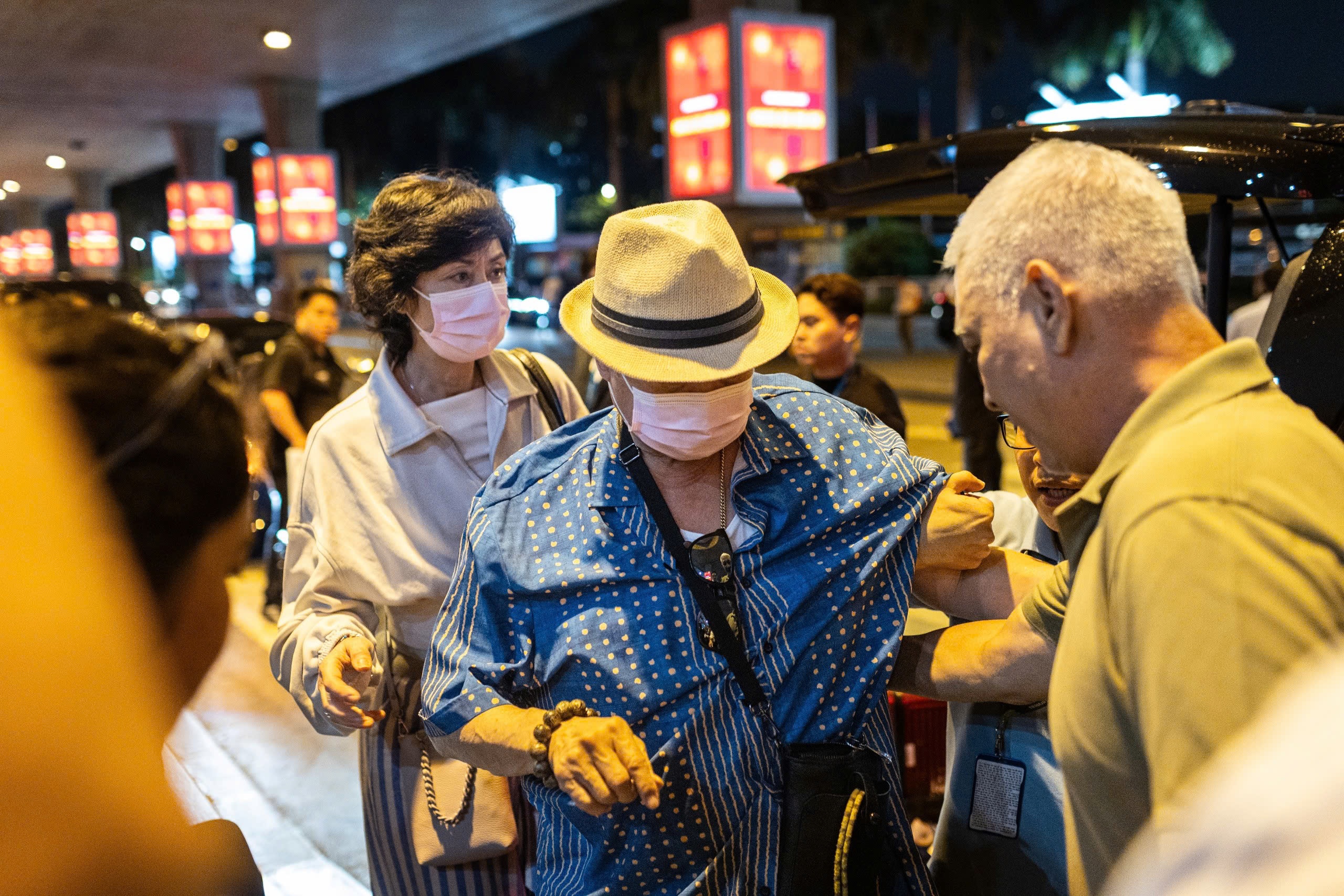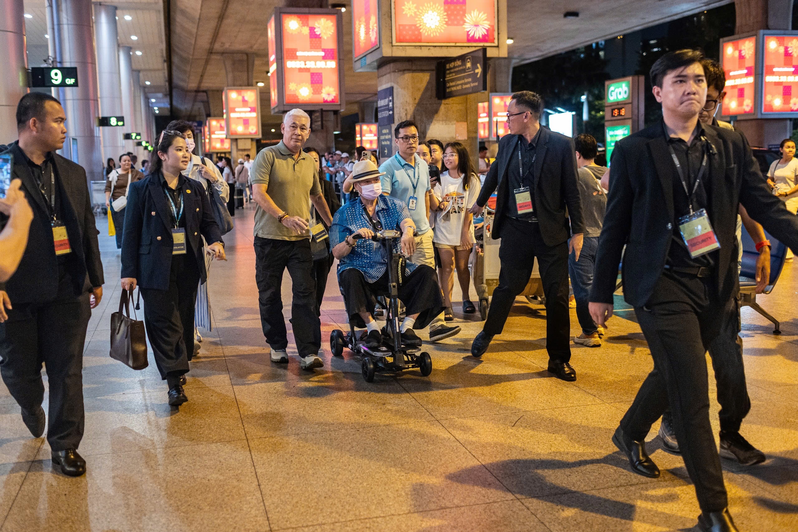 Ngôi sao Phi long mãnh tướng thu hút sự chú ý khi xuất hiện tại sân bay Tân Sơn Nhất (TP.HCM) vào tối 5/11. Hồng Kim Bảo ngồi xe lăn, được đội ngũ vệ sĩ theo sát. Tài tử đeo khẩu trang che kín mặt.