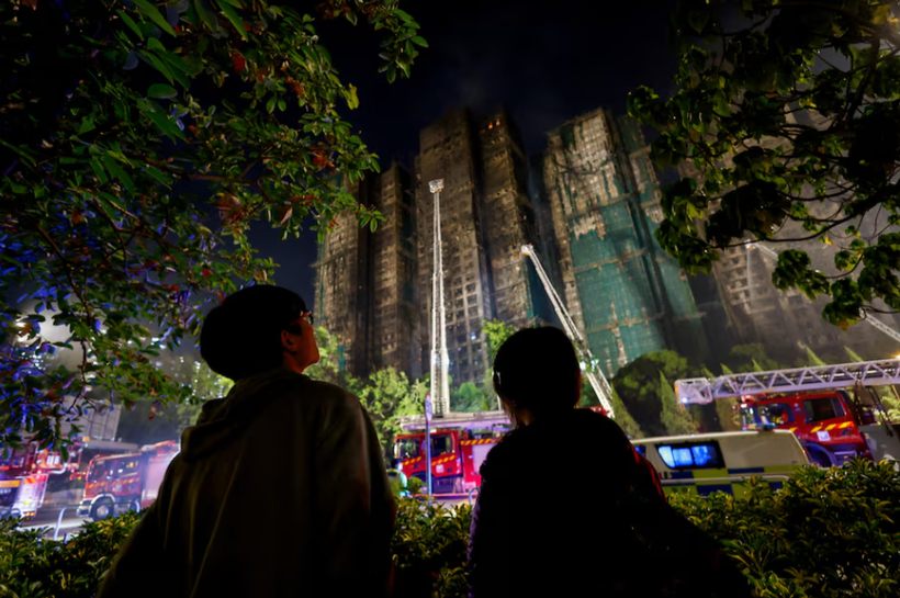 Người dân đứng gần hiện trường vụ hỏa hoạn chết người tại khu nhà ở Wang Fuk Court, trong khi lính cứu hỏa vẫn đang nỗ lực dập tắt đám cháy tại Hong Kong, Trung Quốc vào ngày 27/11. Ảnh: Reuters.