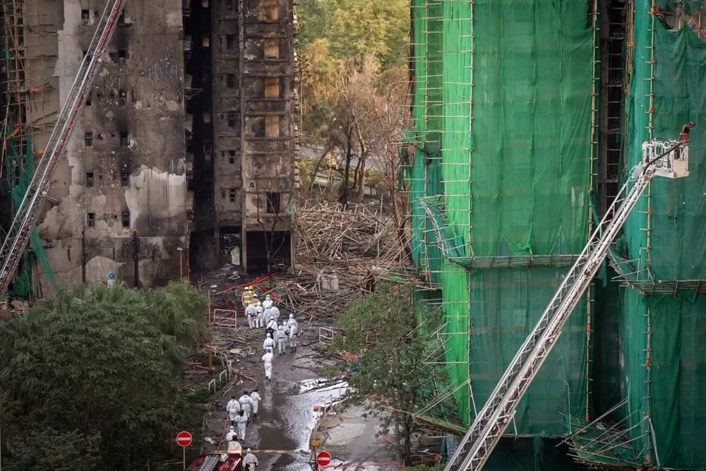 Hiện trường vụ cháy tại khu chung cư Wang Fuk Court (quận Tai Po, Hong Kong) trong ngày 28-11, ngày thứ ba kể từ khi lửa bùng phát. Ảnh: SOUTH CHINA MORNING POST