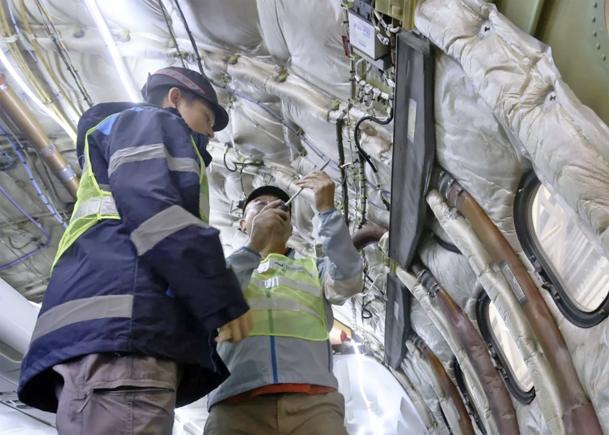 Giảng viên Martin Law (phải), người từng được đào tạo tại cơ sở của Elior ở Pháp hướng dẫn học viên thao tác trên hệ thống cấp điện của máy bay.