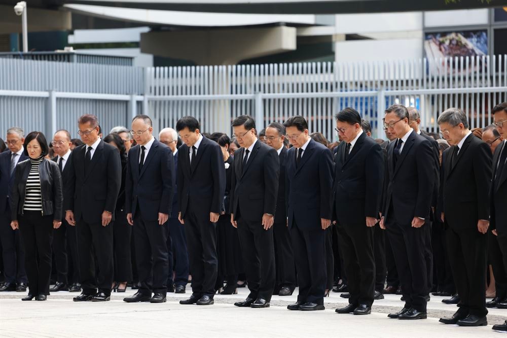 Sáng 29-11, Trưởng Đặc khu hành chính Hồng Kông John Lee Ka-chiu cùng các quan chức cấp cao đã tưởng niệm nạn nhân vụ cháy. Ảnh: China Daily.