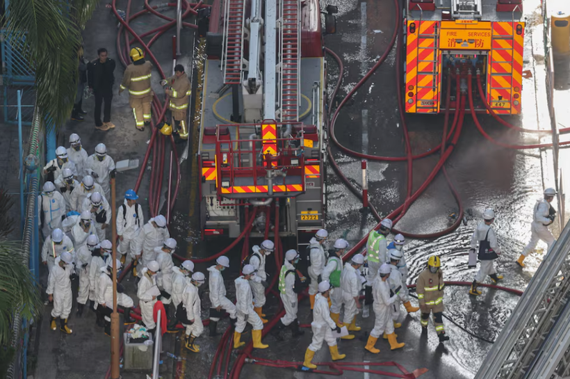 Cảnh sát mặc đồ bảo hộ đi bộ gần hiện trường vụ cháy chung cư tại khu nhà ở Wang Fuk Court sau vụ hỏa hoạn chết người ở Tai Po, Hong Kong, Trung Quốc, ngày 29/11. Ảnh: Reuters.