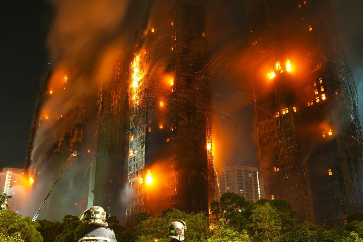 Trong vụ cháy cụm chung cư quận Đại Bộ ngày 26/11, lửa lan rất nhanh qua hệ thống tre và lưới bọc, bao trùm toàn bộ mặt ngoài tòa nhà trong thời gian ngắn.. Ảnh: Karma Lo/SCMP