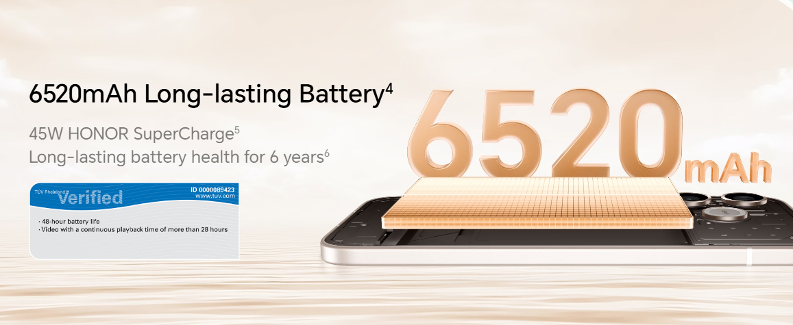 Máy hỗ trợ công nghệ sạc nhanh có dây 45W Honor SuperCharge giúp rút ngắn đáng kể thời gian nạp lại năng lượng khi cần thiết. Bên cạnh đó, thiết bị còn tích hợp nhiều kết nối hiện đại như bluetooth 6.0 và NFC, đạt chuẩn kháng nước và bụi IP66, cho phép chống bụi cũng như chịu được tia nước trong các điều kiện sử dụng thông thường.