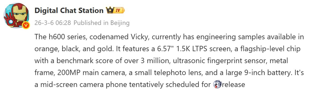 Các nguyên mẫu kỹ thuật của HONOR 600 (tên mã Vicky) hiện xuất hiện với ba tùy chọn màu sắc gồm Cam, Đen và Vàng. Phiên bản tiêu chuẩn dự kiến trang bị màn hình LTPS kích thước 6.57 inch với độ phân giải 1.5K. Đáng chú ý, thiết bị sở hữu một dòng chipset cao cấp có khả năng đạt số điểm kỷ lục hơn 3 triệu trên các nền tảng đo hiệu năng AnTuTu.