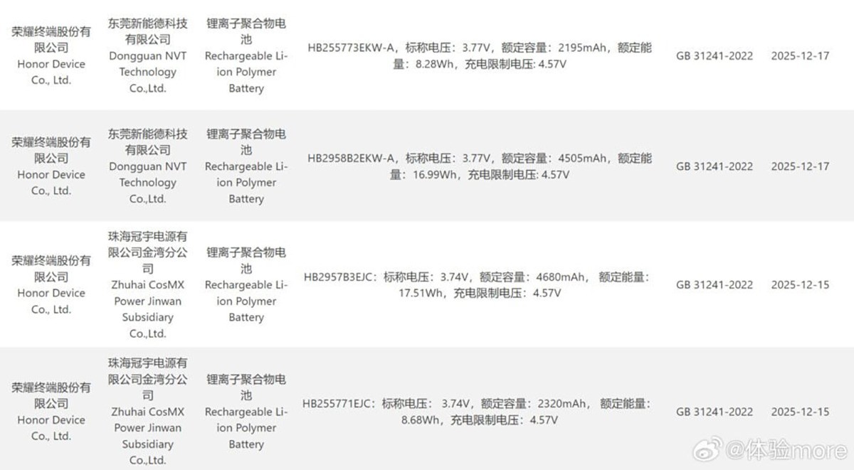 Thông tin rò rỉ cho thấy Magic V6 có thể sở hữu viên pin lớn nhất từng thấy trên một chiếc điện thoại gập. Một bức ảnh chụp màn hình từ leaker nổi tiếng Experience More cho biết pin của Magic V6 đã được cơ quan 3C của Trung Quốc chứng nhận, với phiên bản cao cấp nhất dự kiến sử dụng pin kép, tổng dung lượng thực tế khoảng 7.150 mAh. Con số này vượt mốc 7.000 mAh và cao hơn 1.000 mAh so với thế hệ trước, Magic V5. Đây là một thành tựu ấn tượng, đặc biệt trong bối cảnh điện thoại gập thường bị hạn chế về không gian pin.