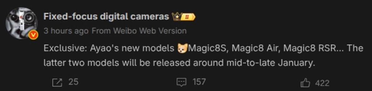 Mẫu máy cuối cùng trong danh sách là Magic 8 RSR. Đây là phiên bản kế nhiệm của dòng Magic 7 RSR, thường là sự hợp tác thiết kế đặc biệt. Magic 8 RSR dự kiến sẽ chia sẻ phần lớn cấu hình phần cứng với phiên bản Magic 8 Pro nhưng có ngoại hình cao cấp và độc bản hơn.