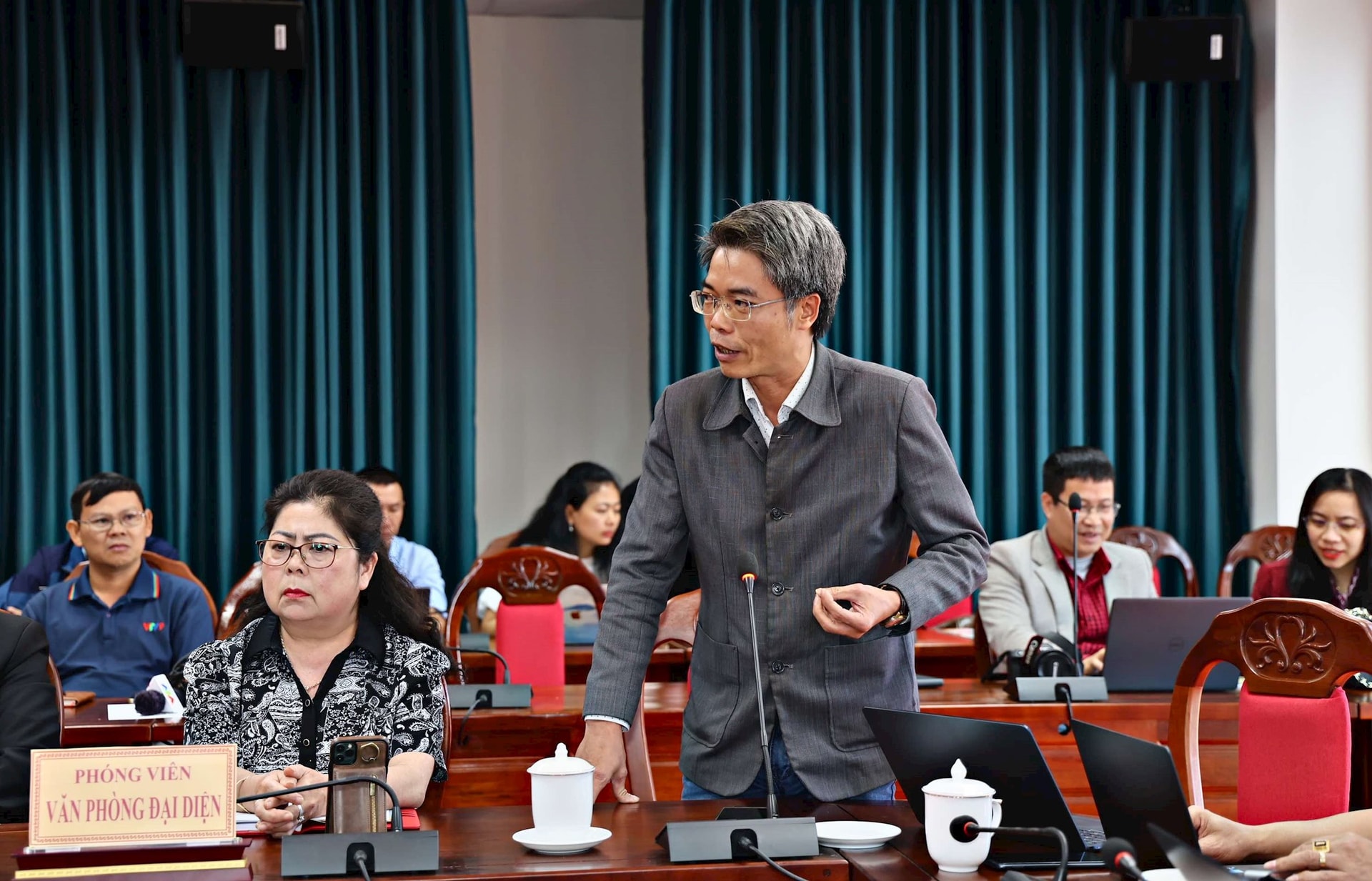 Nhà báo Khoa Điềm, Đài Tiếng nói Việt Nam (VOV) tại Lâm Đồng đặt câu hỏi tại buổi họp báo
