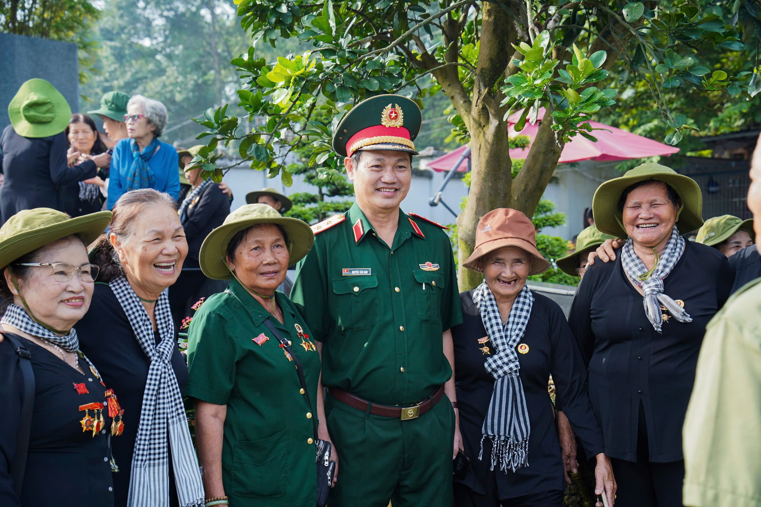 Thiếu tướng Vũ Văn Điền, Ủy viên Ban Thường vụ Thành ủy, Tư lệnh Bộ Tư lệnh TPHCM ân cần thăm hỏi đời sống, sức khỏe các nữ du kích Củ Chi