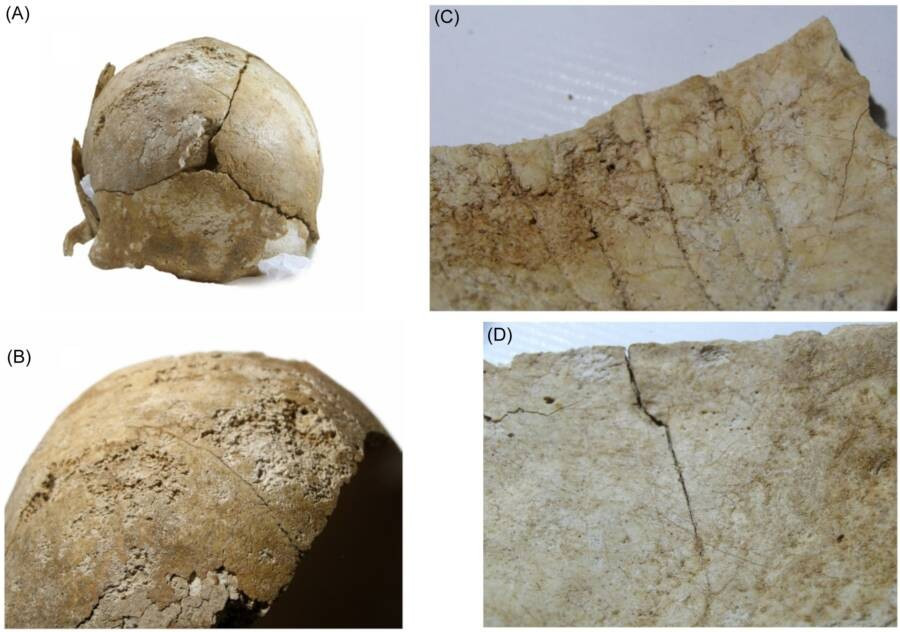 Căn cứ vào tình trạng của hộp sọ: màu sắc nhạt, tình trạng vỡ vụn và việc thiếu các xương khác, các nhà nghiên cứu nghi ngờ hộp sọ đã bị phơi ngoài trời trong thời gian dài thay vì được chôn cất. Ảnh: Santiago D. Domínguez-Solera.