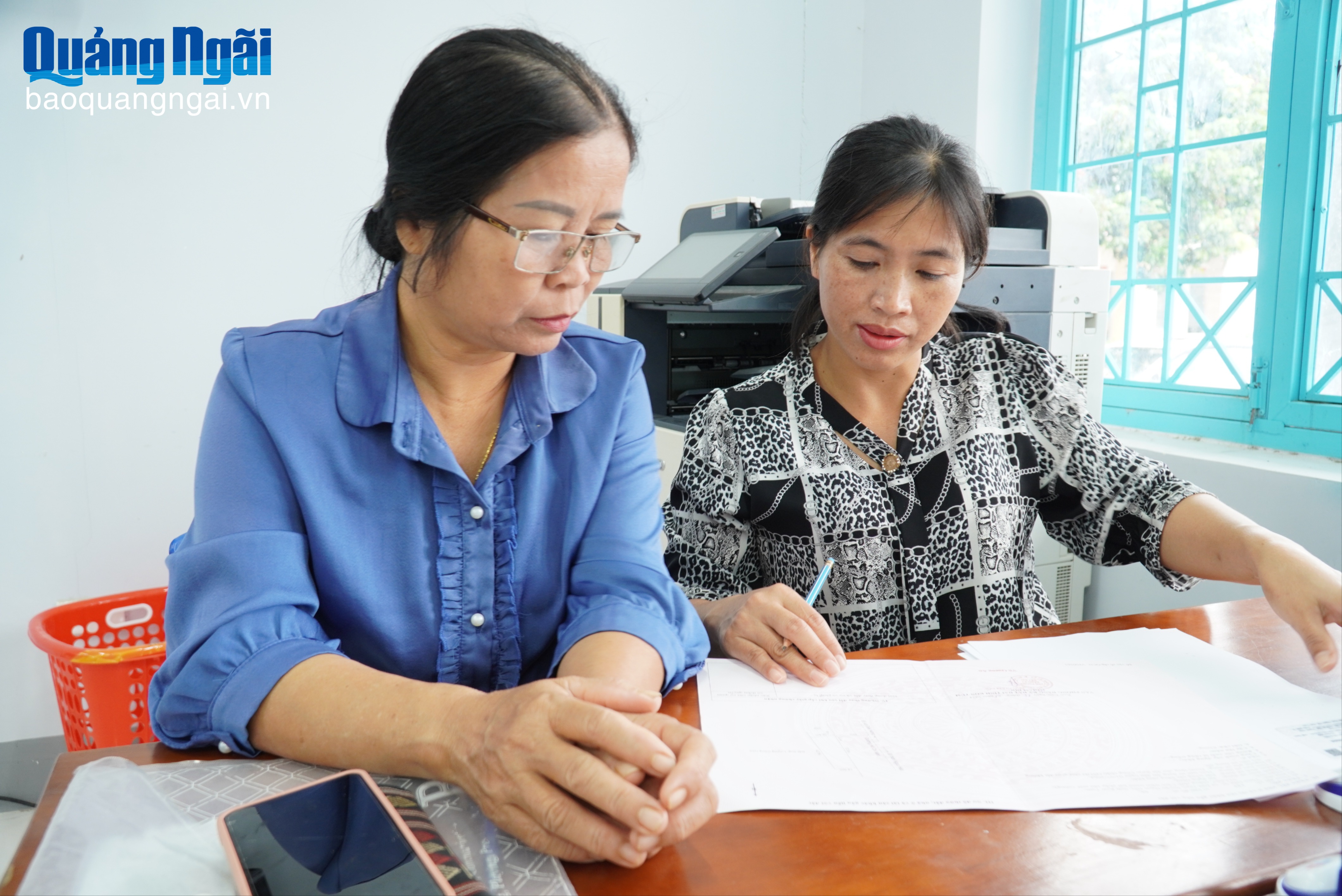 Bà Mai Thị Hoa Nguyệt (bên trái), ở thôn Đăk Xi, xã Dục Nông được chuyên viên Trung tâm Phục vụ hành chính công xã hướng dẫn, hỗ trợ thực hiện việc thu thập, xác thực thông tin đất đai.