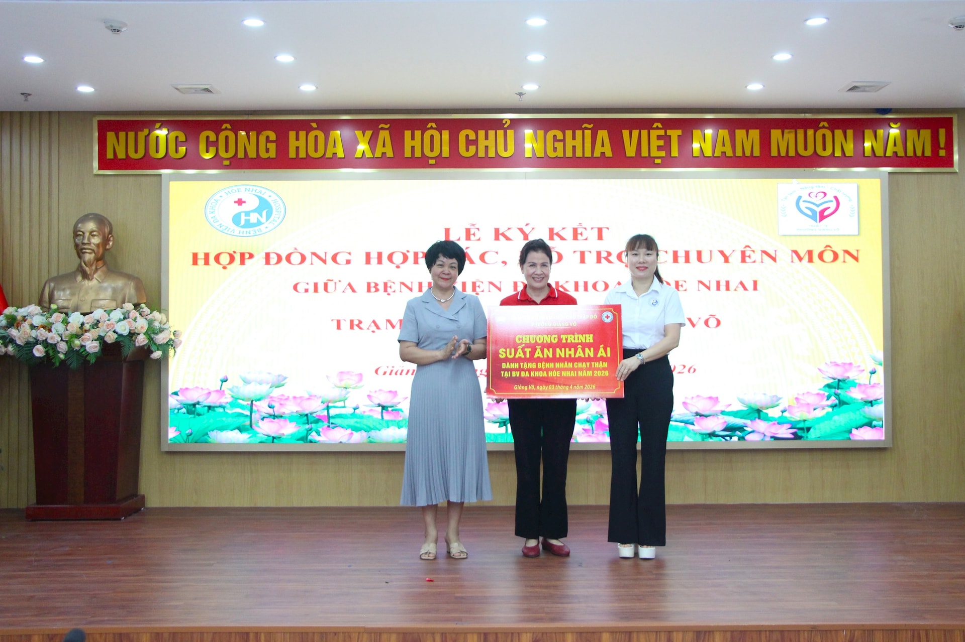 Tại buổi lễ, Giám đốc Bệnh viện Đa khoa Hòe Nhai Phan Thị Thanh Bình và Giám đốc Trạm Y tế phường Giảng Võ Nguyễn Thanh Hiếu đã đại diện cho hai đơn vị ký kết hợp đồng hợp tác, hỗ trợ chuyên môn, tập trung chuyển giao chuyên môn, đào tạo và hỗ trợ kỹ thuật để nâng cao năng lực khám, chữa bệnh ngay tại cơ sở, đồng thời mở rộng các dịch vụ y tế gần dân, an toàn, hiệu quả. Công tác hợp tác, hỗ trợ nhằm tăng cường năng lực y tế tuyến cơ sở, nâng cao chất lượng khám, chữa bệnh và phòng, chống bệnh tật trên địa bàn phường.