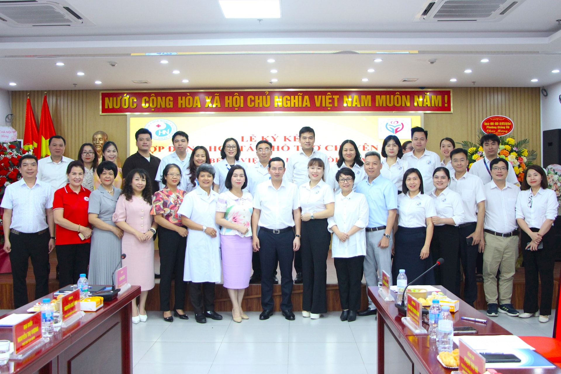 Đội ngũ cán bộ, bác sĩ, nhân viên y tế Bệnh viện Đa khoa Hòe Nhai và Trạm Y tế phường Giảng Võ chụp ảnh lưu niệm với lãnh đạo phường Giảng Võ nhân dịp lễ ký kết. Ảnh: TT