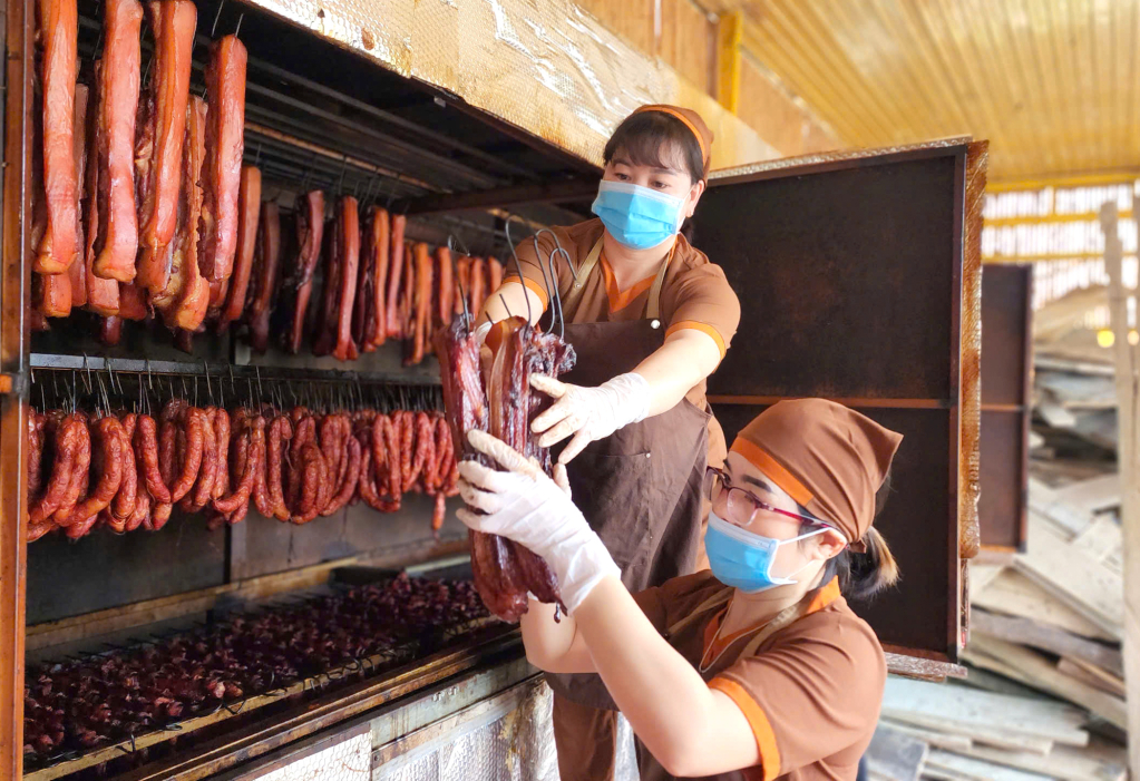 Hợp tác xã chế biến thực phẩm Tân Thịnh sản xuất thịt lợn hun khói phục vụ thị trường dịp Tết Nguyên đán.