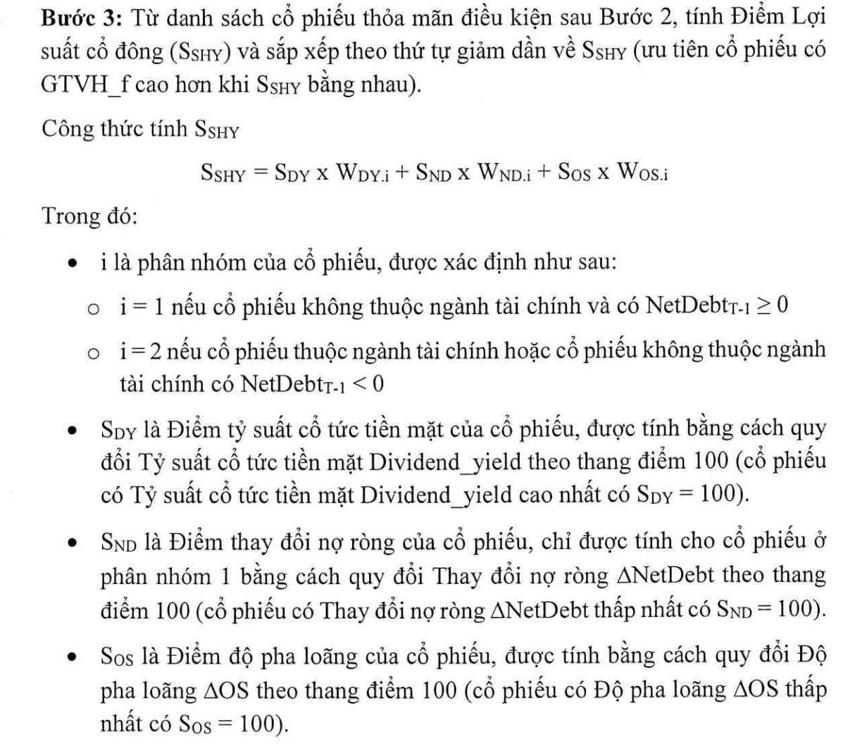 Từ danh sách thỏa mãn điều kiện trên, chọn các mã cổ phiếu chi trả cổ tức bằng tiền mặt tiên tục trong 3 năm liền kề trước năm xem xét, sau đó tính điềm lợi suất cổ đông và sắp xếp theo thứ tự. Điểm lợi suất cổ đông sẽ được tính dựa trên điểm tỷ suất cổ tức tiền mặt của cổ phiếu, điểm thay đổi nợ ròng của cổ phiếu, điểm độ pha loãng cổ phiếu và được tính theo quy tắc của HoSE để chọn ra các cổ phiếu thỏa mãn điều kiện.