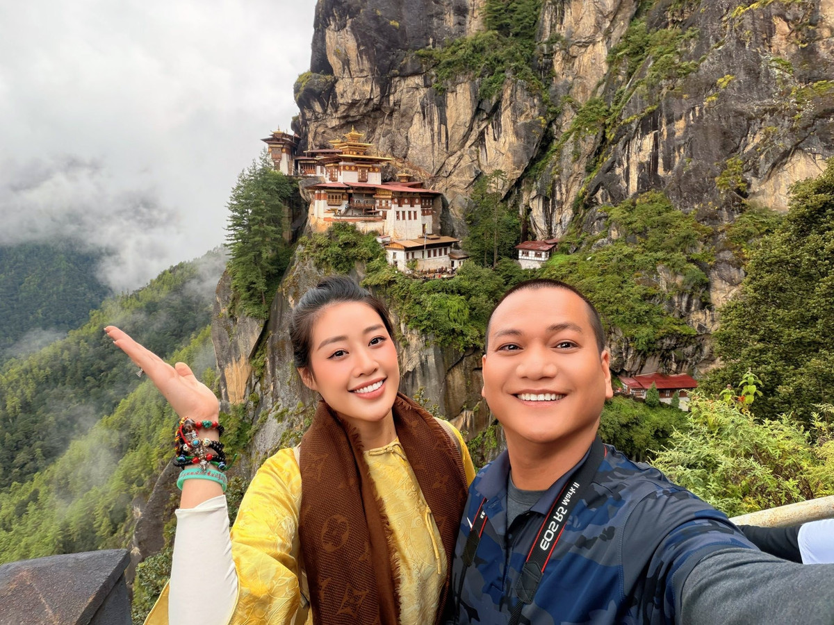 Khánh Vân cho biết hành trình đáng nhớ nhất trong chuyến đi Bhutan của vợ chồng cô là hơn ba tiếng leo dốc để lên Tiger's Nest (Tu viện Hang hổ). Ảnh: FB Nguyễn Trần Khánh Vân