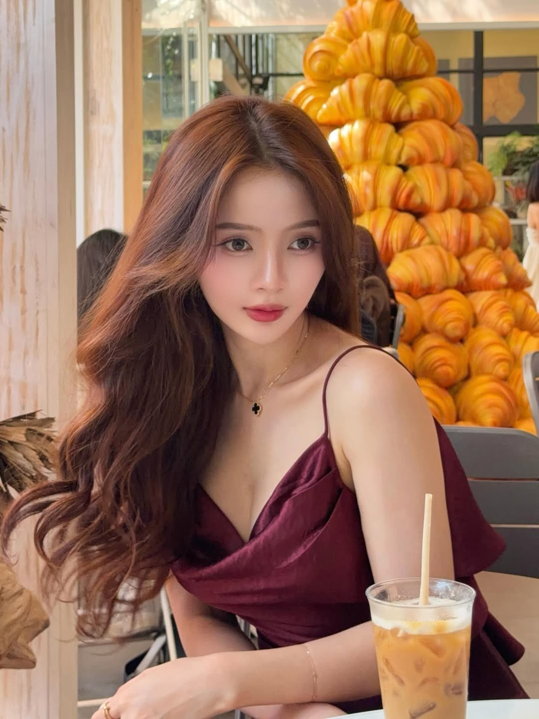 Cô nàng diện chiếc váy hai dây màu đỏ rượu vang với thiết kế vô cùng tinh tế và táo bạo. Phần thân trước xẻ sâu khéo léo khoe vòng một đầy đặn. (Ảnh: IGNV)