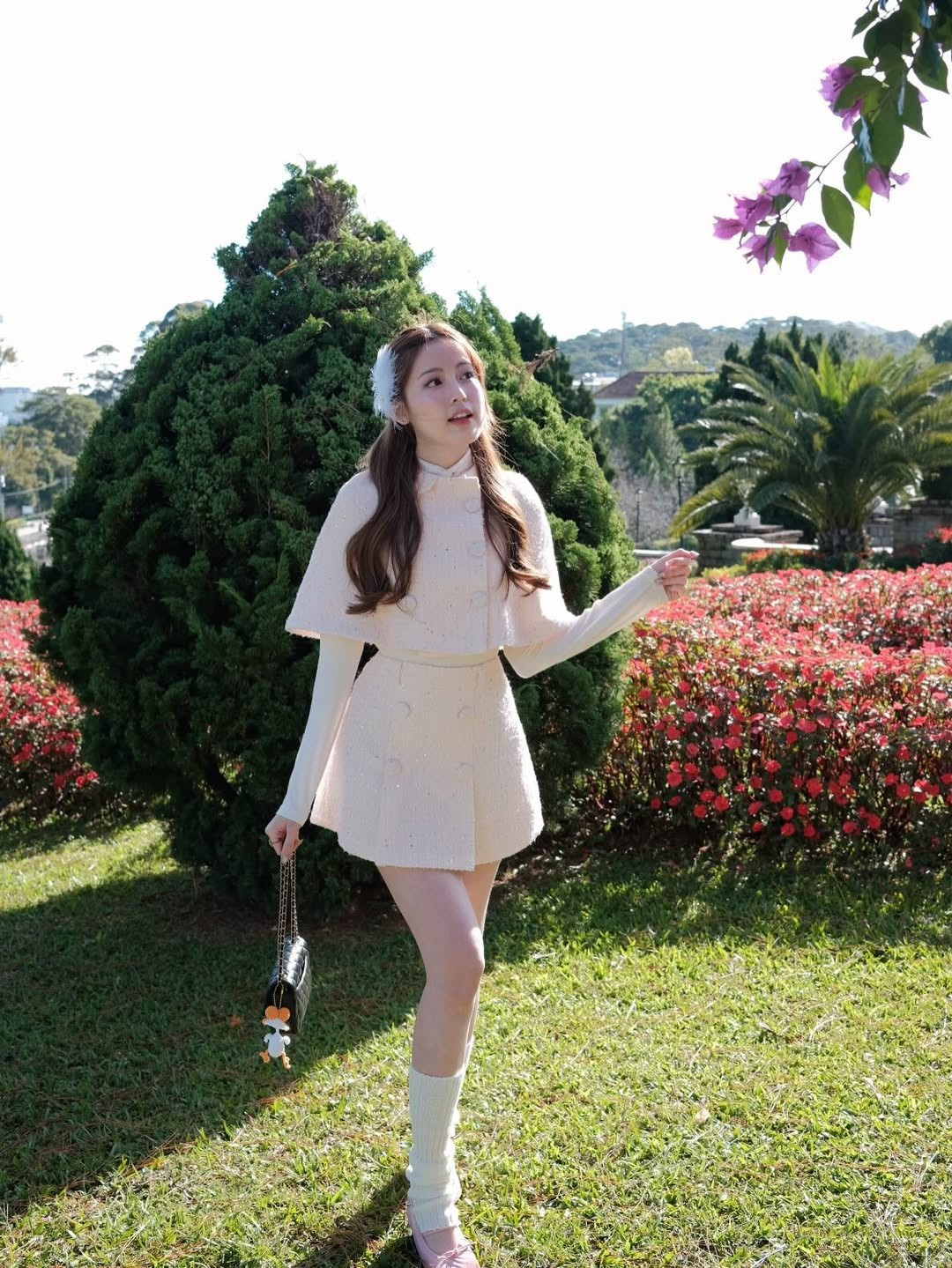 Dưới ánh nắng tự nhiên, làn da trắng mịn cùng thần thái thư thái khiến người đẹp sinh năm 2003 trông như bước ra từ một thước phim thanh xuân.