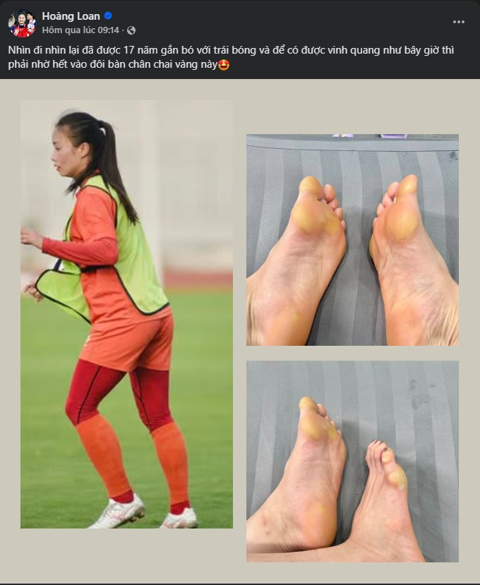 Trên trang cá nhân, Hoàng Thị Loan viết kèm dòng chú thích ngắn gọn nhưng đầy cảm xúc: "Nhìn đi nhìn lại đã được 17 năm gắn bó với trái bóng và giờ lãi được bàn chân chai vàng".