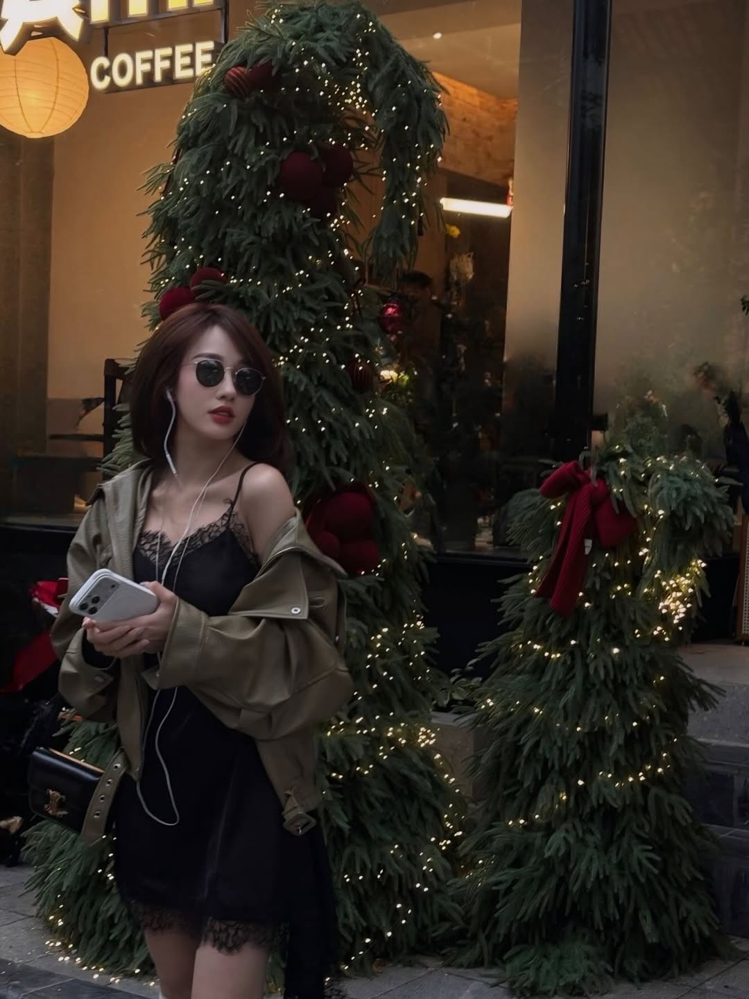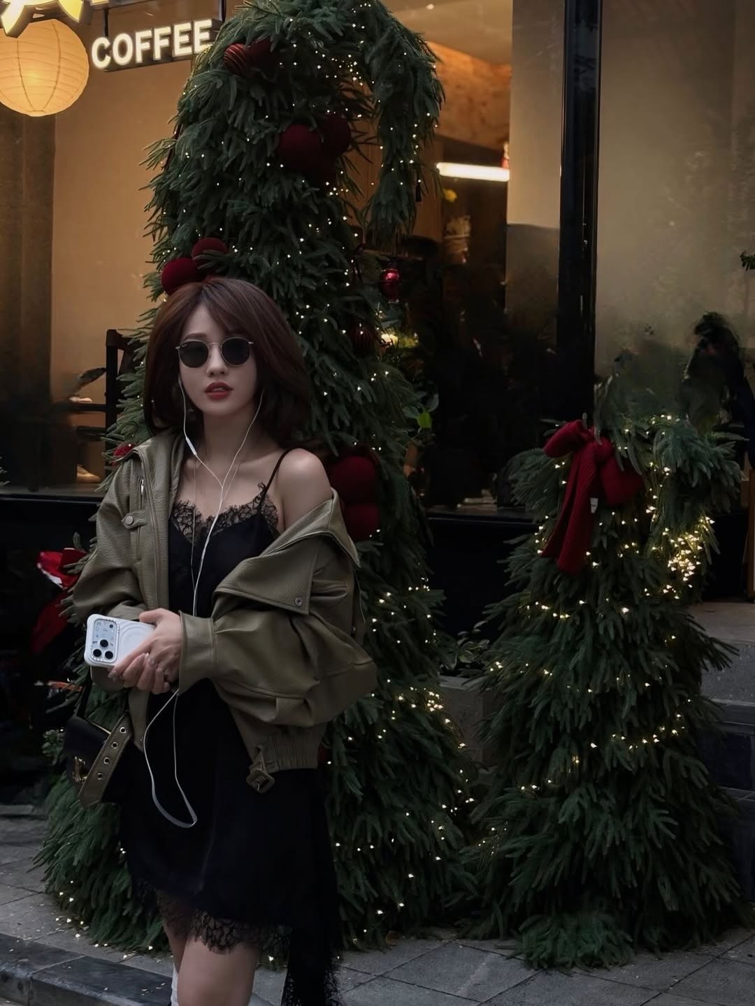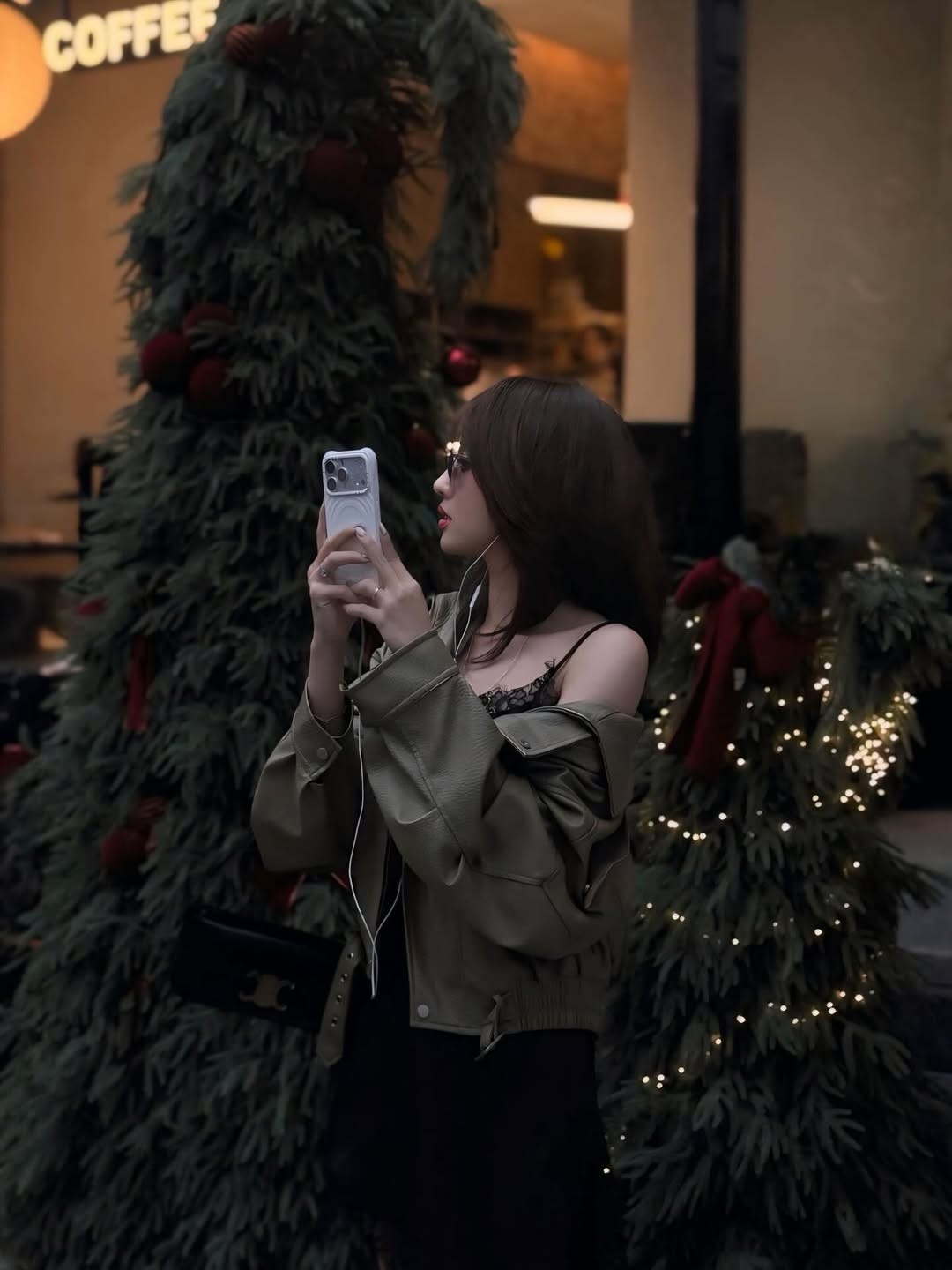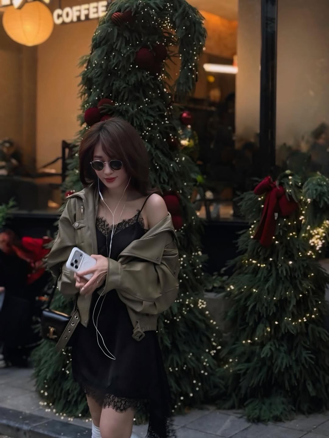 Điểm nhấn hoàn hảo là chiếc áo khoác da màu xanh olive được khoác hờ trên vai, tạo nên sự đối lập thú vị giữa nét quyến rũ của chiếc váy lụa và sự mạnh mẽ, "cool ngầu" của chất liệu da, đồng thời giữ ấm vừa đủ cho không khí se lạnh cuối năm. (Ảnh: IGNV)