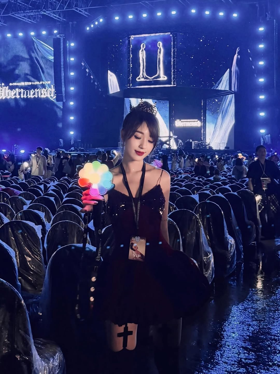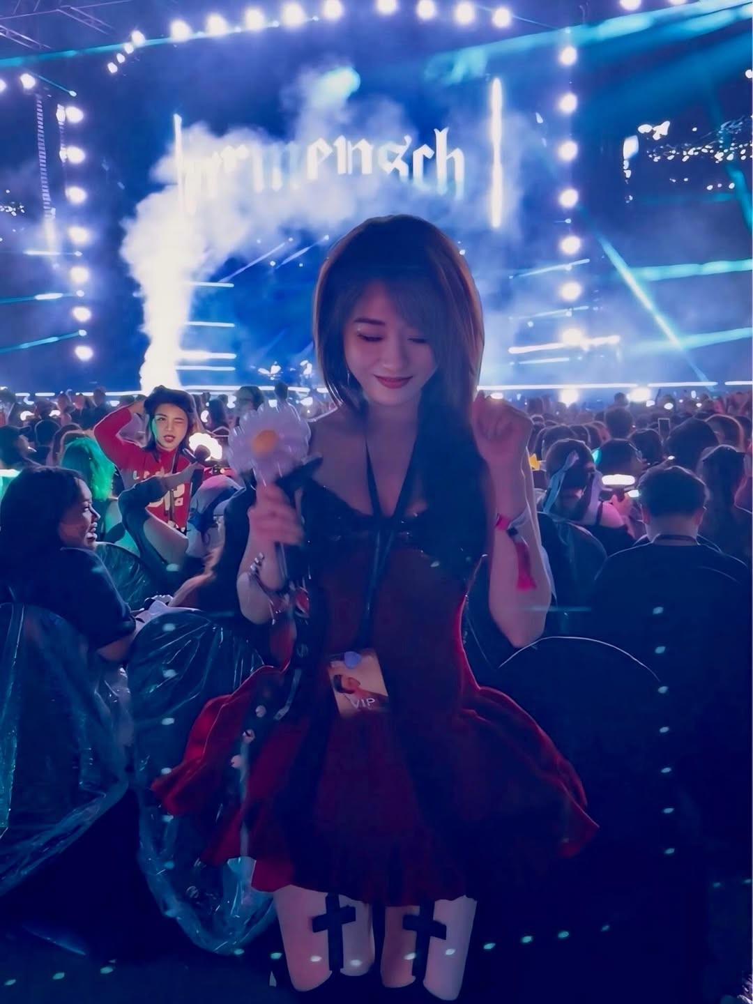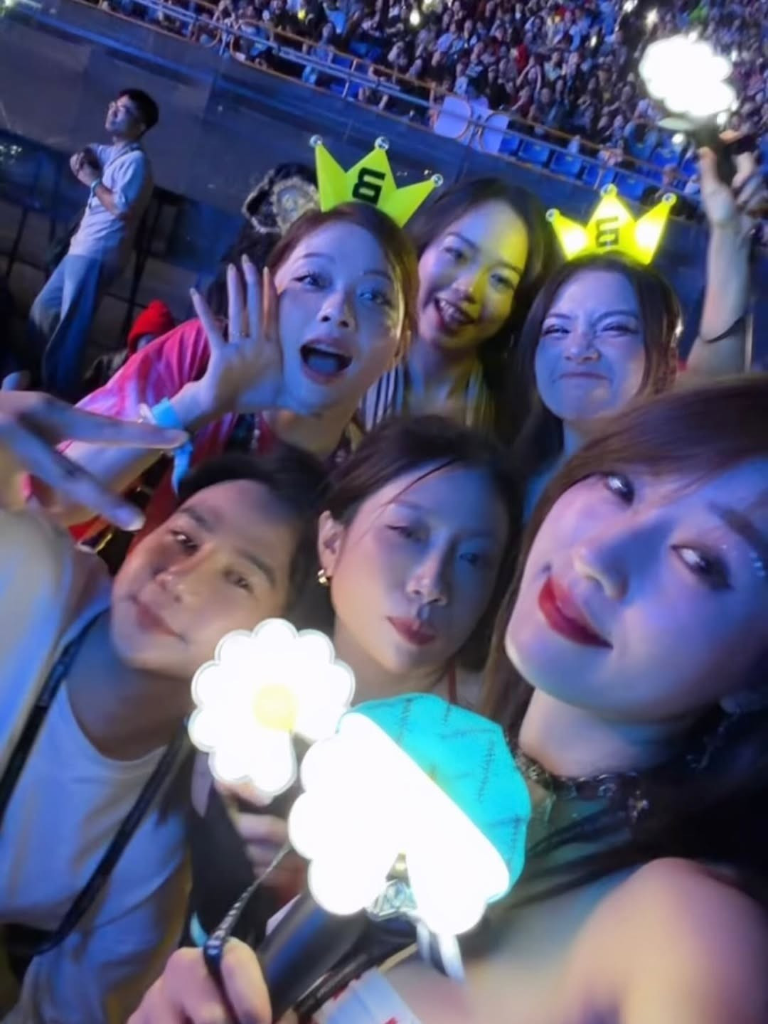 Phụ kiện không thể thiếu là lightstick hoa cúc độc đáo của G-Dragon. Hà Kim cùng nhóm bạn đã có những khoảnh khắc check-in đầy năng lượng, thể hiện sự cuồng nhiệt với thần tượng. (Ảnh: IGNV)
