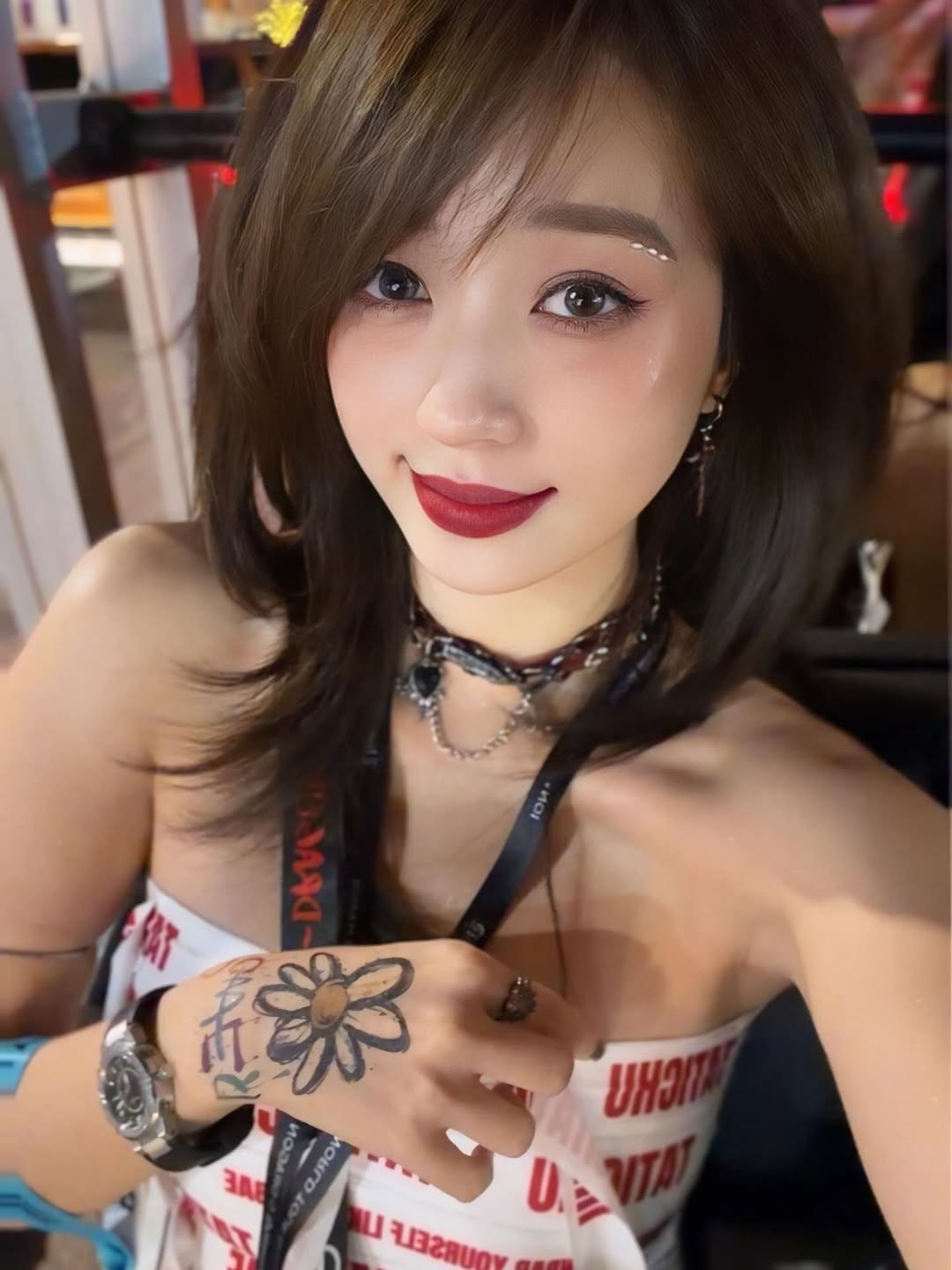 Cô nàng diện một chiếc crop top cúp ngực màu trắng với họa tiết chữ in graphic cá tính. Trang phục được phối cùng quần short da bóng màu nâu đỏ và tất đùi trắng, tạo nên tổng thể vừa sexy vừa có chút hoài niệm Y2K pha lẫn Punk-Rock. (Ảnh: IGNV)