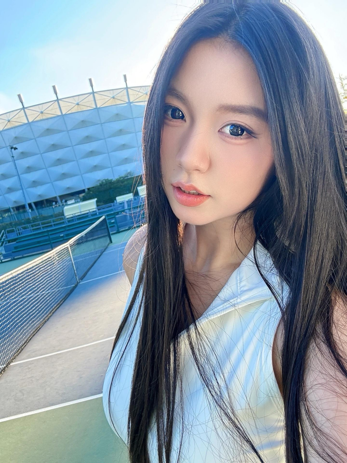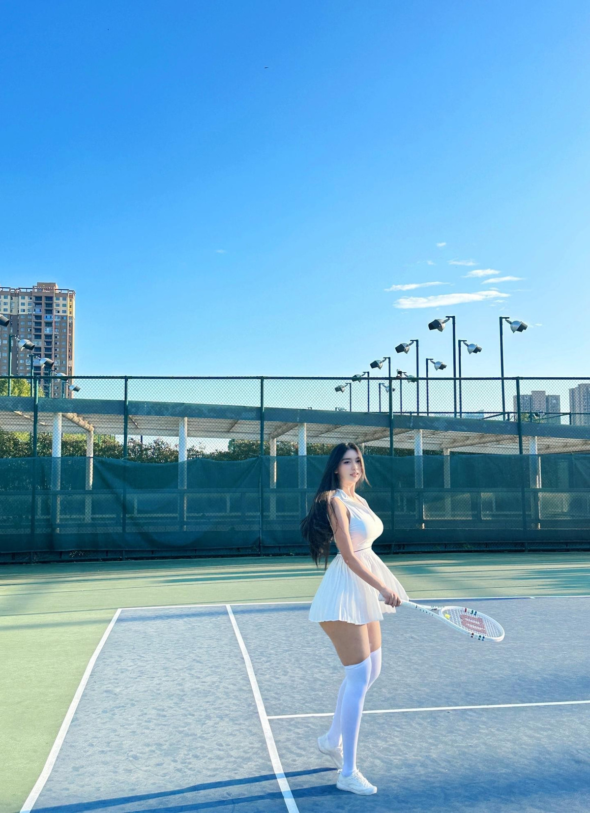 Trong bộ ảnh mới, Sae Beyok xuất hiện trên sân cầu với set đồ trắng quyến rũ gồm váy ngắn xếp ly, áo không tay và đôi vớ cao tới gối.