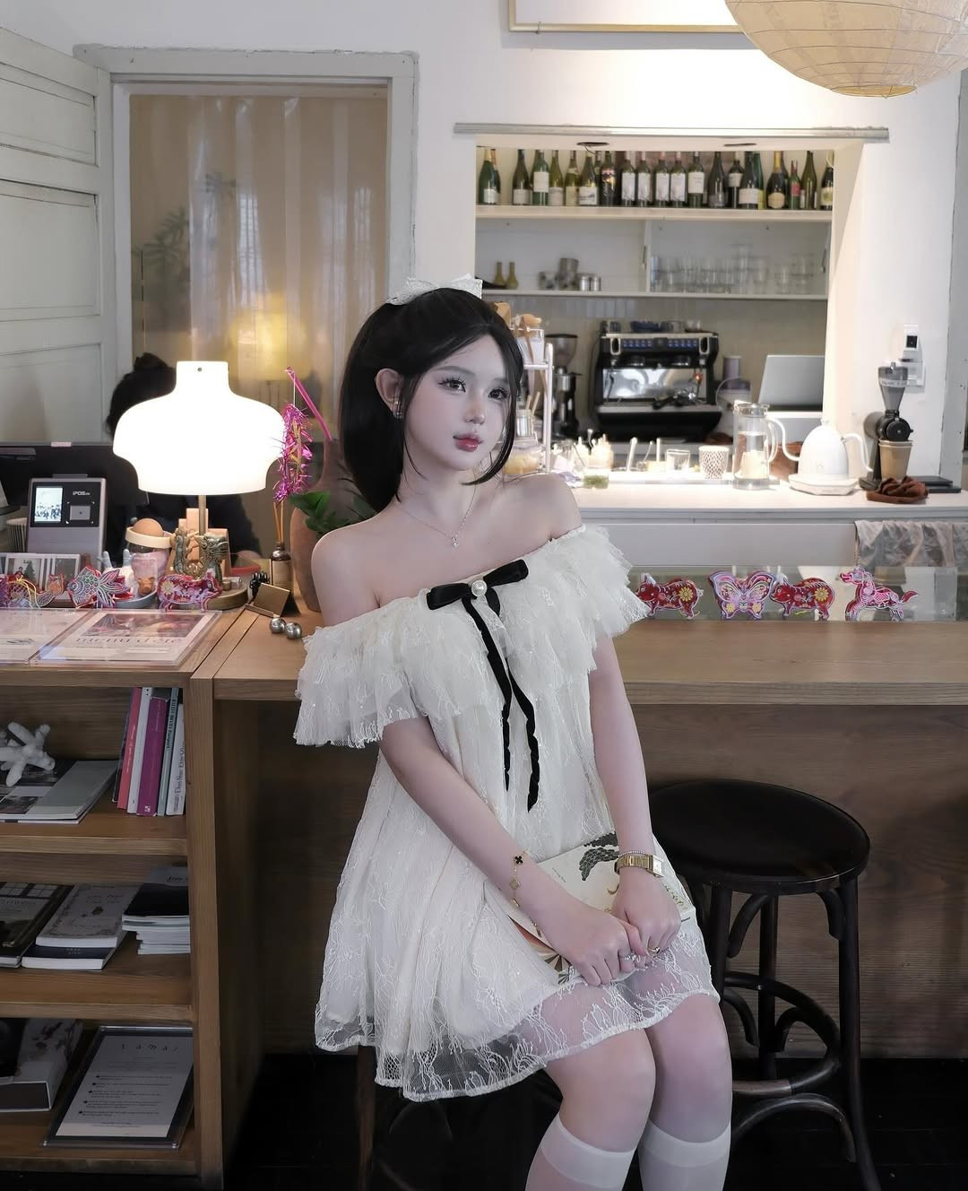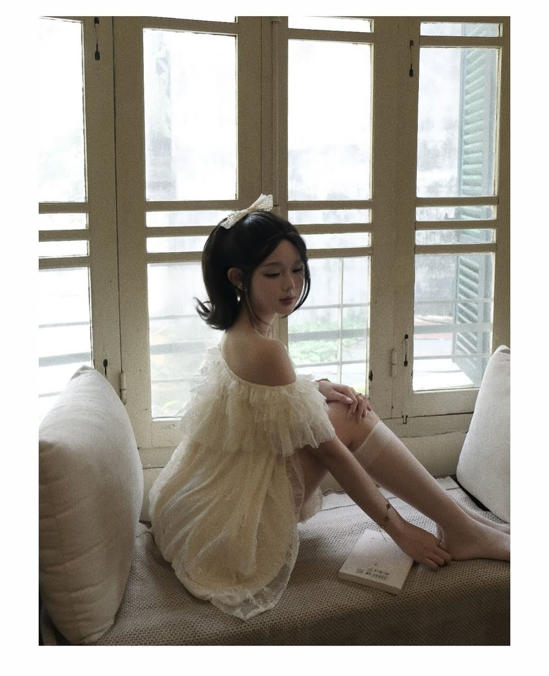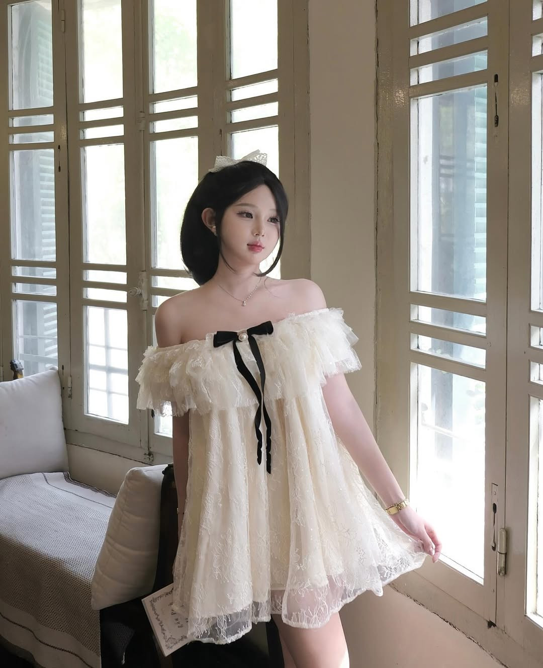 Cô nàng chọn diện một chiếc váy ngắn bồng bềnh, chất liệu ren màu trắng kem. Thiết kế nổi bật với phần trễ vai giúp cô khoe khéo bờ vai trần mảnh mai, xương quai xanh quyến rũ, làm tăng thêm vẻ gợi cảm tinh tế. (Ảnh: IGNV)