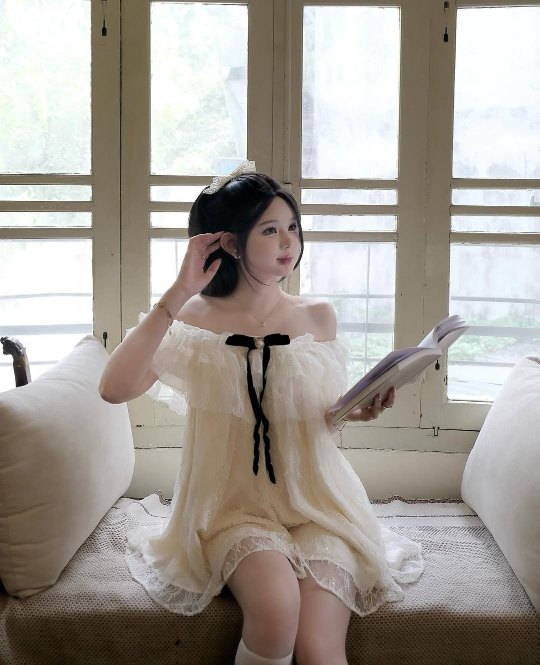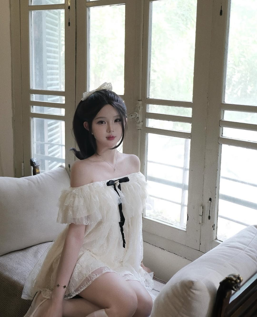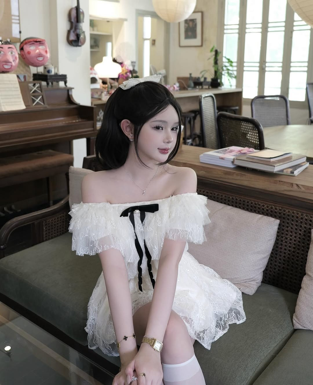 Cô nàng chọn diện một chiếc váy ngắn bồng bềnh, chất liệu ren màu trắng kem. Thiết kế nổi bật với phần trễ vai giúp cô khoe khéo bờ vai trần mảnh mai, xương quai xanh quyến rũ, làm tăng thêm vẻ gợi cảm tinh tế. (Ảnh: IGNV)