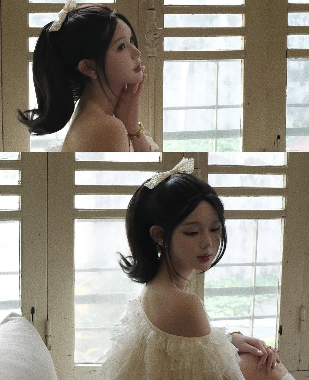 Mái tóc đen được cột cao, tô điểm bằng một chiếc nơ trắng, gợi nhớ đến những nhân vật trong truyện cổ tích. Cô kết hợp thêm đôi tất cao cổ trắng càng làm nổi bật đôi chân thon thả và phong cách lolita dịu dàng. (Ảnh: IGNV)