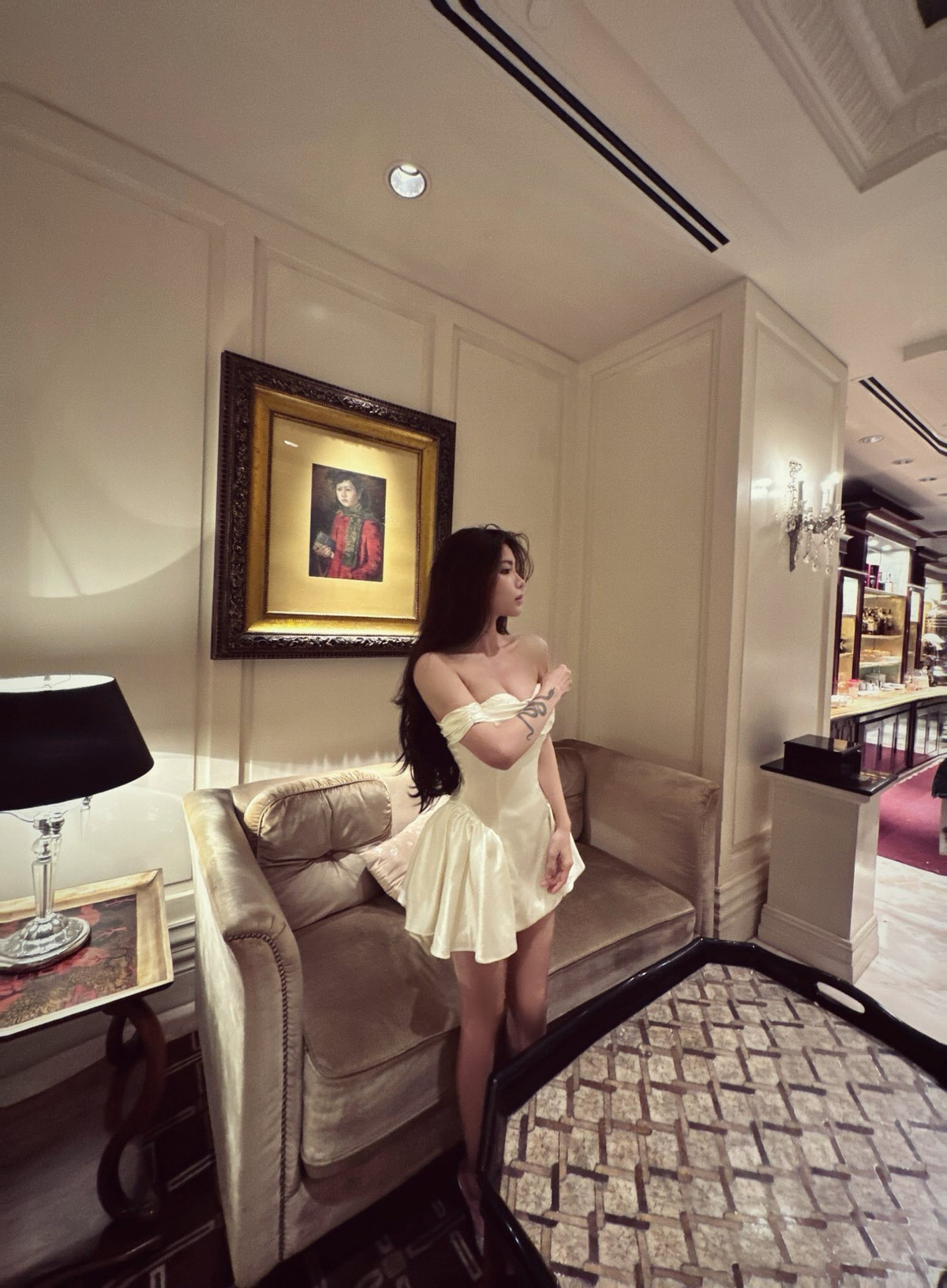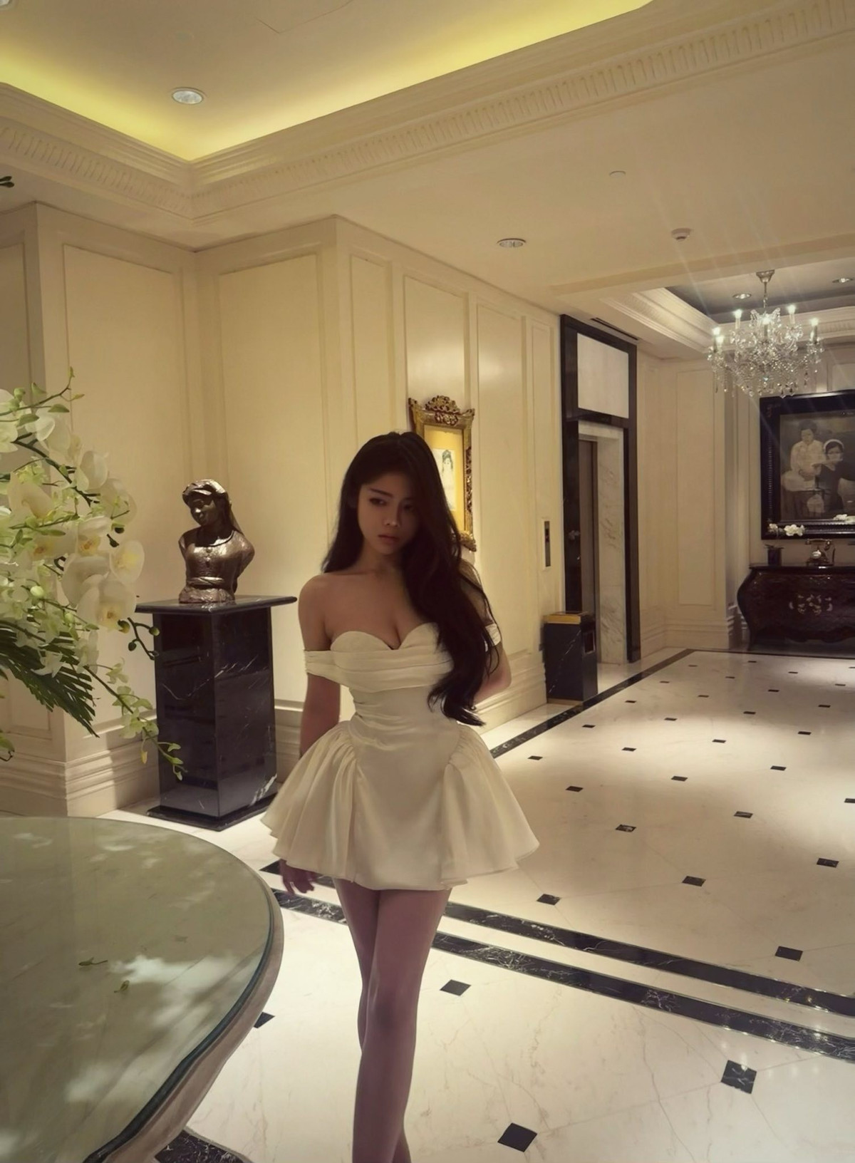 Cô khoác lên mình chiếc mini dress cúp ngực màu trắng kem, với phần thân trên ôm sát, tôn lên vòng một quyến rũ, kết hợp cùng chân váy xòe bồng bềnh tạo nên sự đối lập đầy tinh tế giữa nét gợi cảm và vẻ ngọt ngào, bay bổng. (Ảnh: FBNV)