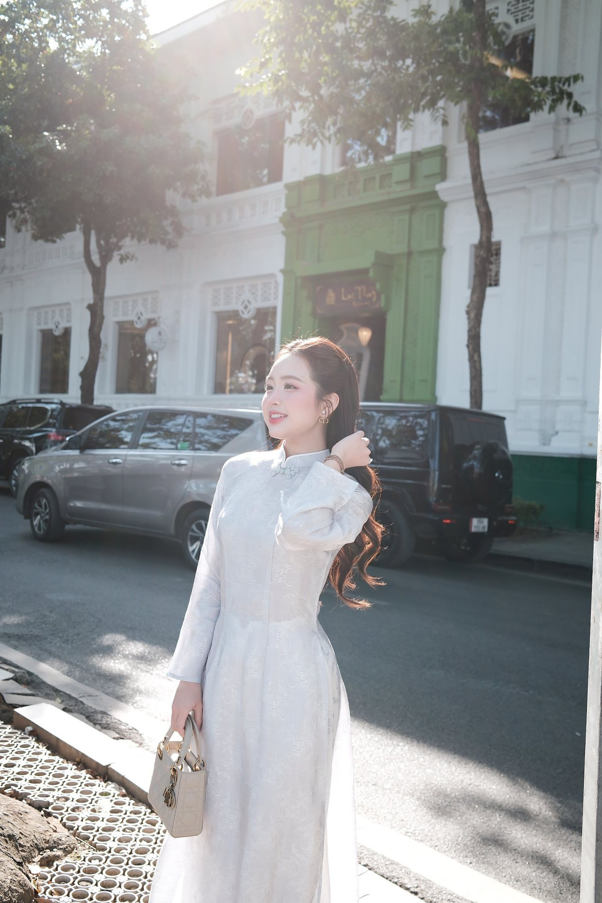 Trong loạt ảnh, Lê Phương Anh diện chiếc áo dài lụa màu bạc ánh kim, họa tiết nhẹ nhàng tinh tế. Chất liệu mềm mại ôm lấy cơ thể giúp tôn lên vóc dáng thon thả, đường cong nữ tính của hot girl sinh năm 1997.