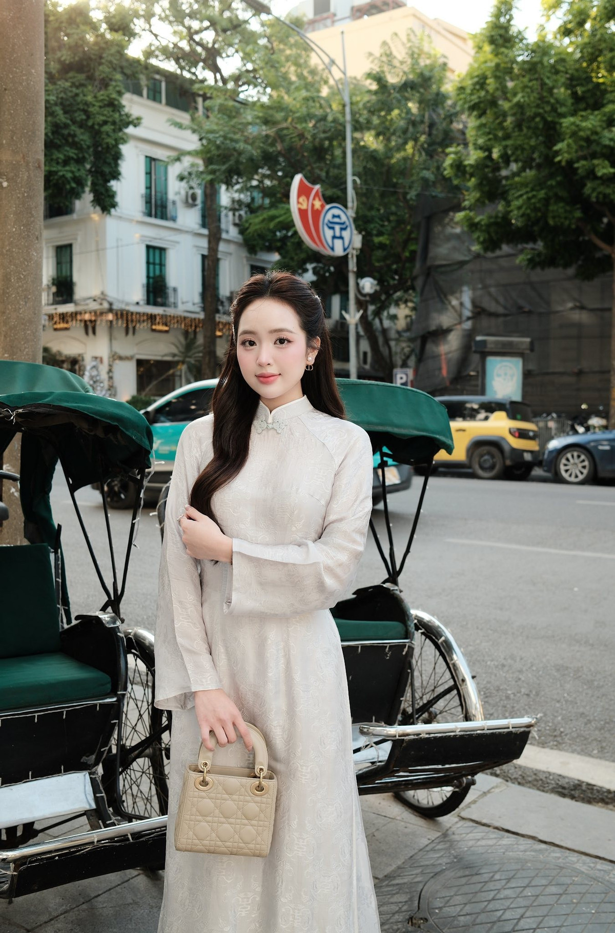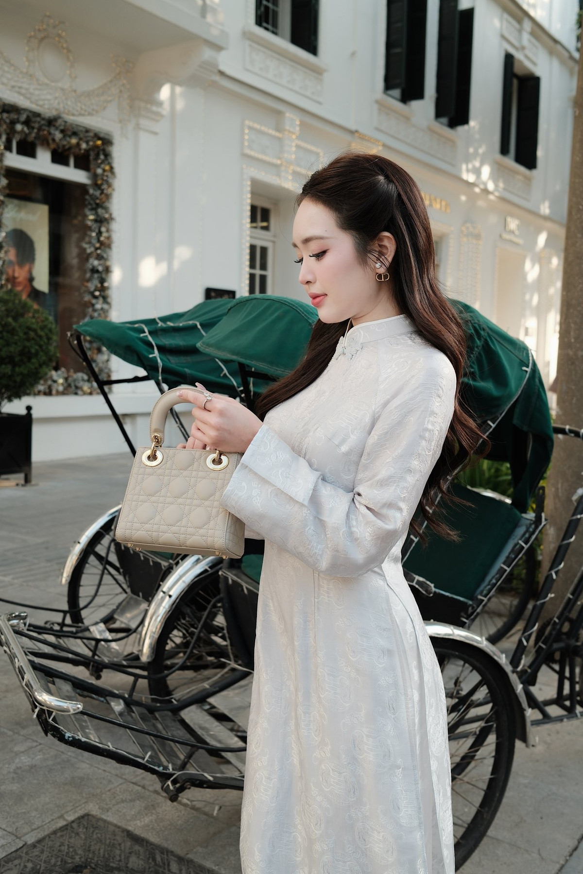 Bên cạnh áo dài, hot girl Hà thành còn khéo léo phối túi xách hàng hiệu càng tăng thêm vẻ thanh lịch mà không làm mất đi sự hài hòa của tổng thể. Sự chỉn chu trong phong cách cho thấy hình ảnh ngày càng trưởng thành và tinh tế của Phương Anh.
