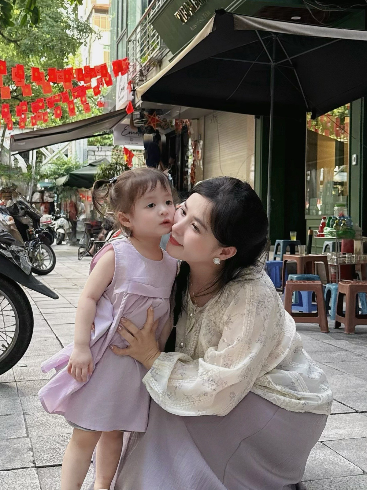 Hình ảnh cô diện áo ren màu kem và chân váy dài màu tím nhạt, tết tóc hai bên, tay trong tay dắt con dạo phố, hay khoảnh khắc âu yếm hôn con cho thấy cuộc sống hạnh phúc, viên mãn của một người mẹ. (Ảnh: IGNV)