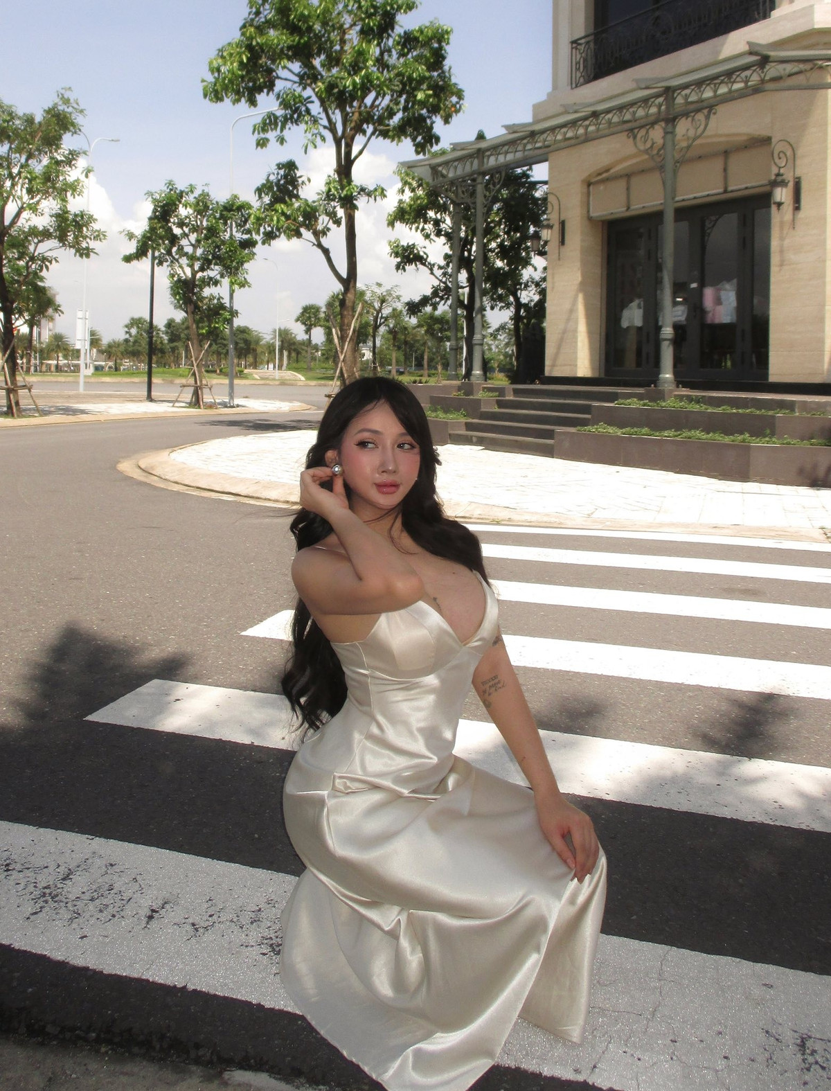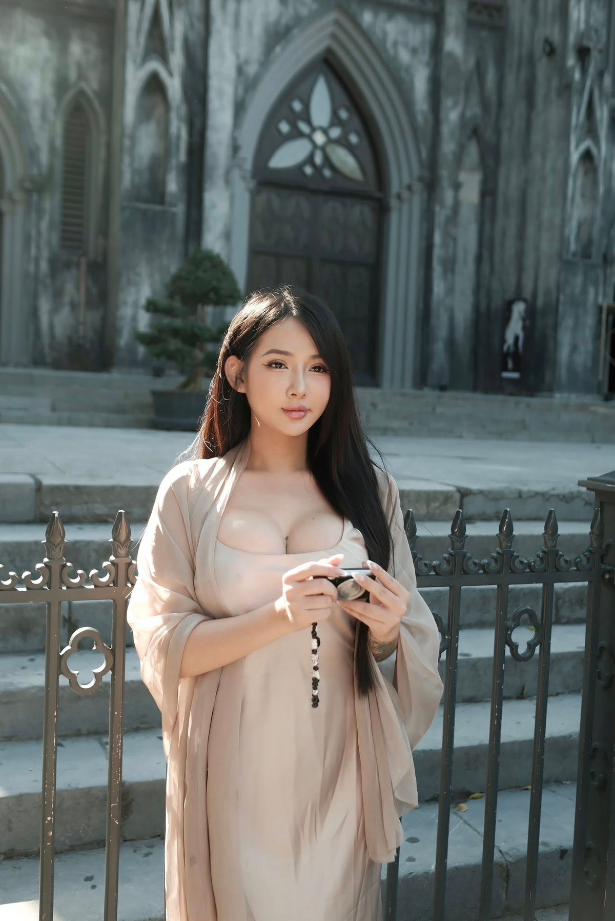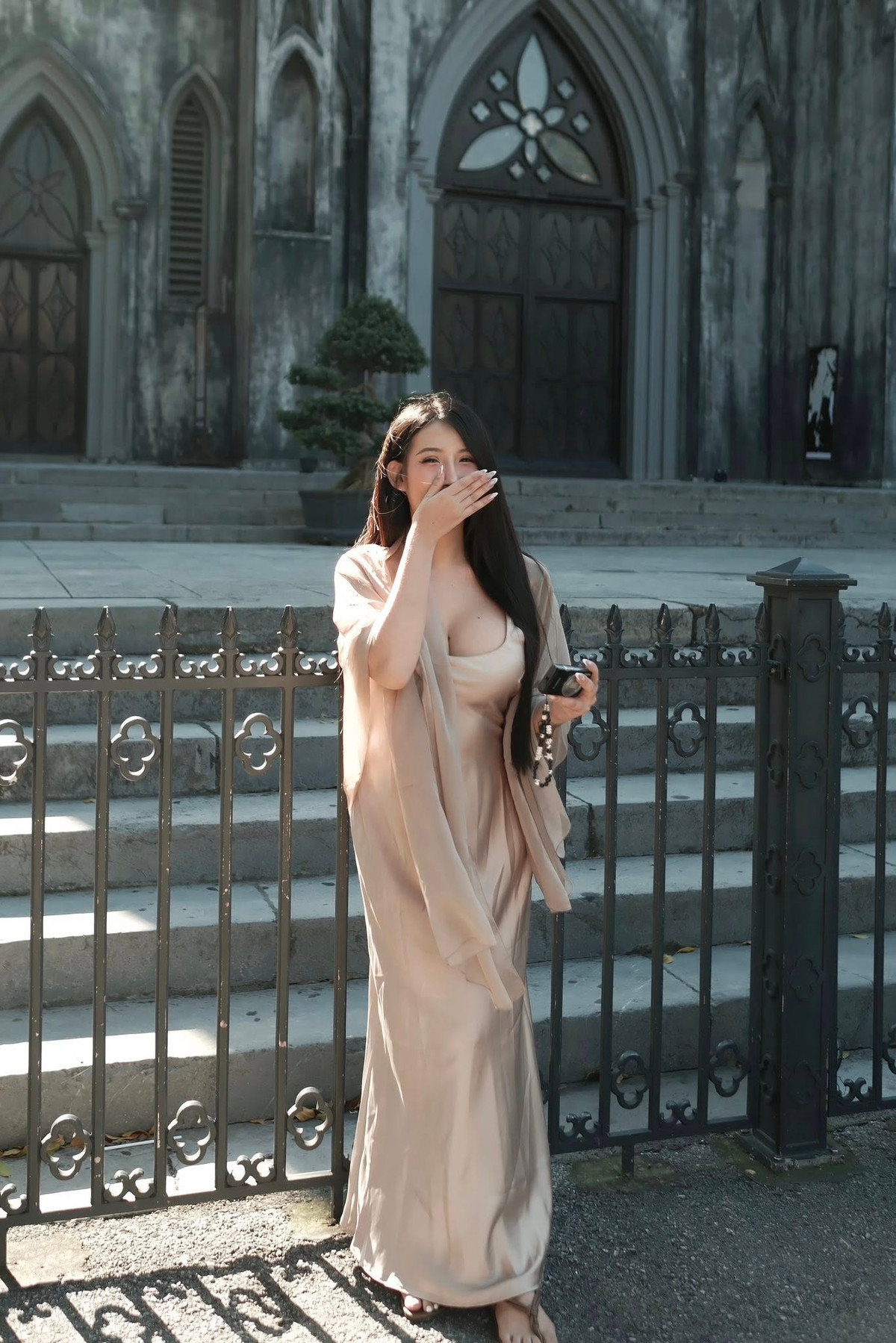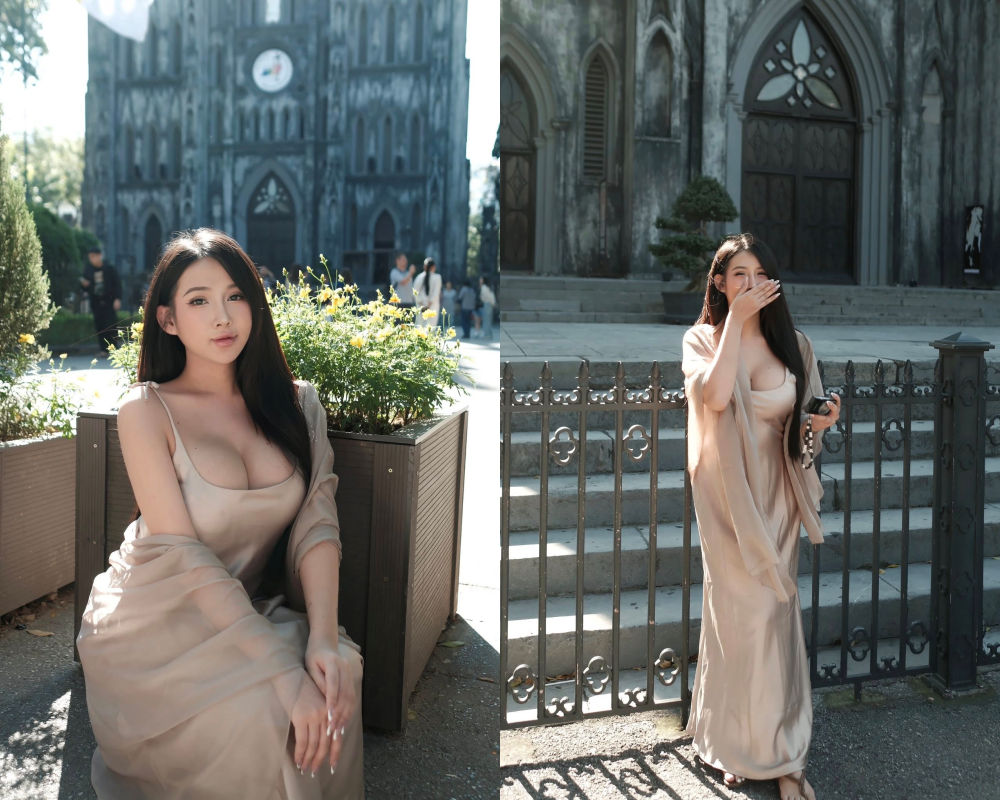 Trong bức ảnh mới đăng tải trên trang cá nhân, hot girl phòng gym Vy Vy Baby diện bộ váy lụa màu nude với lớp vải mềm, rũ ôm sát cơ thể giúp cô nàng trở nên nổi bật giữa không gian cổ kính phía trước nhà thờ.