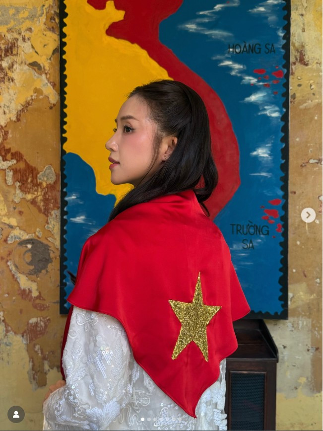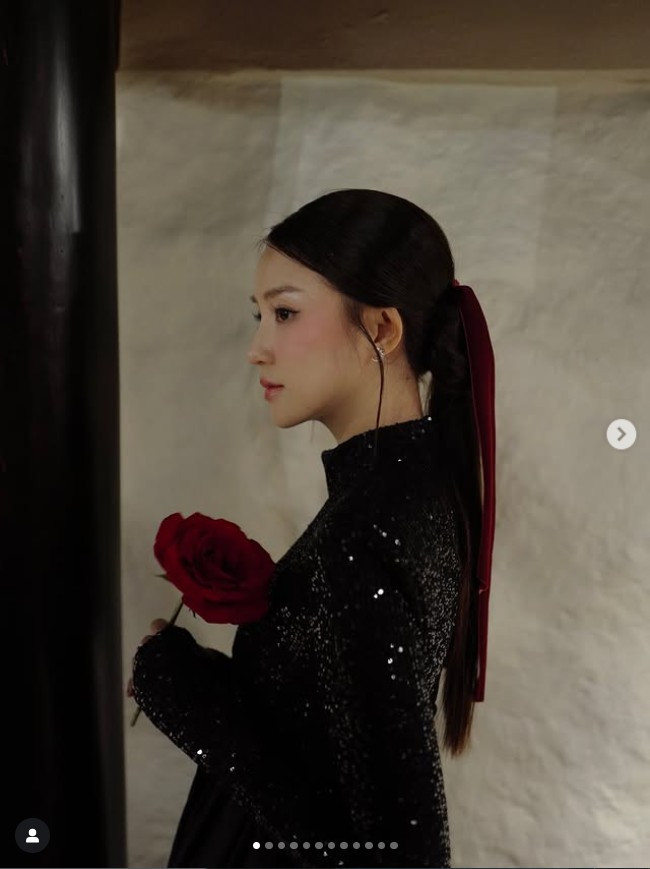 Gương mặt của hot girl 9X vẫn giữ nguyên nét bầu bĩnh, nhỏ xinh, đôi mắt sâu và sáng – vốn là “thương hiệu” khiến khán giả yêu mến suốt hơn 10 năm qua. Son đỏ trầm kết hợp kiểu búi tóc gọn gàng hai bên, điểm xuyết bằng cụm lông xanh mềm mại, giúp cô mang nét đẹp vừa cổ điển vừa sang trọng.