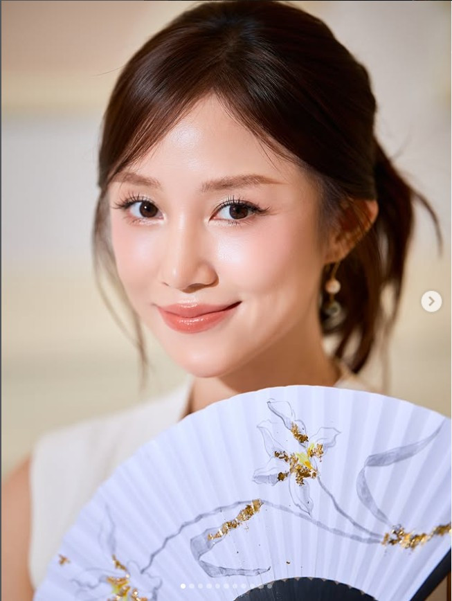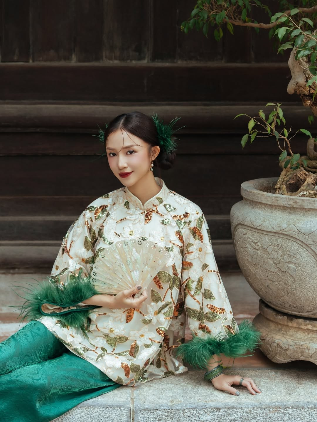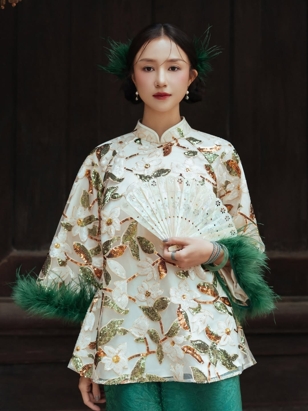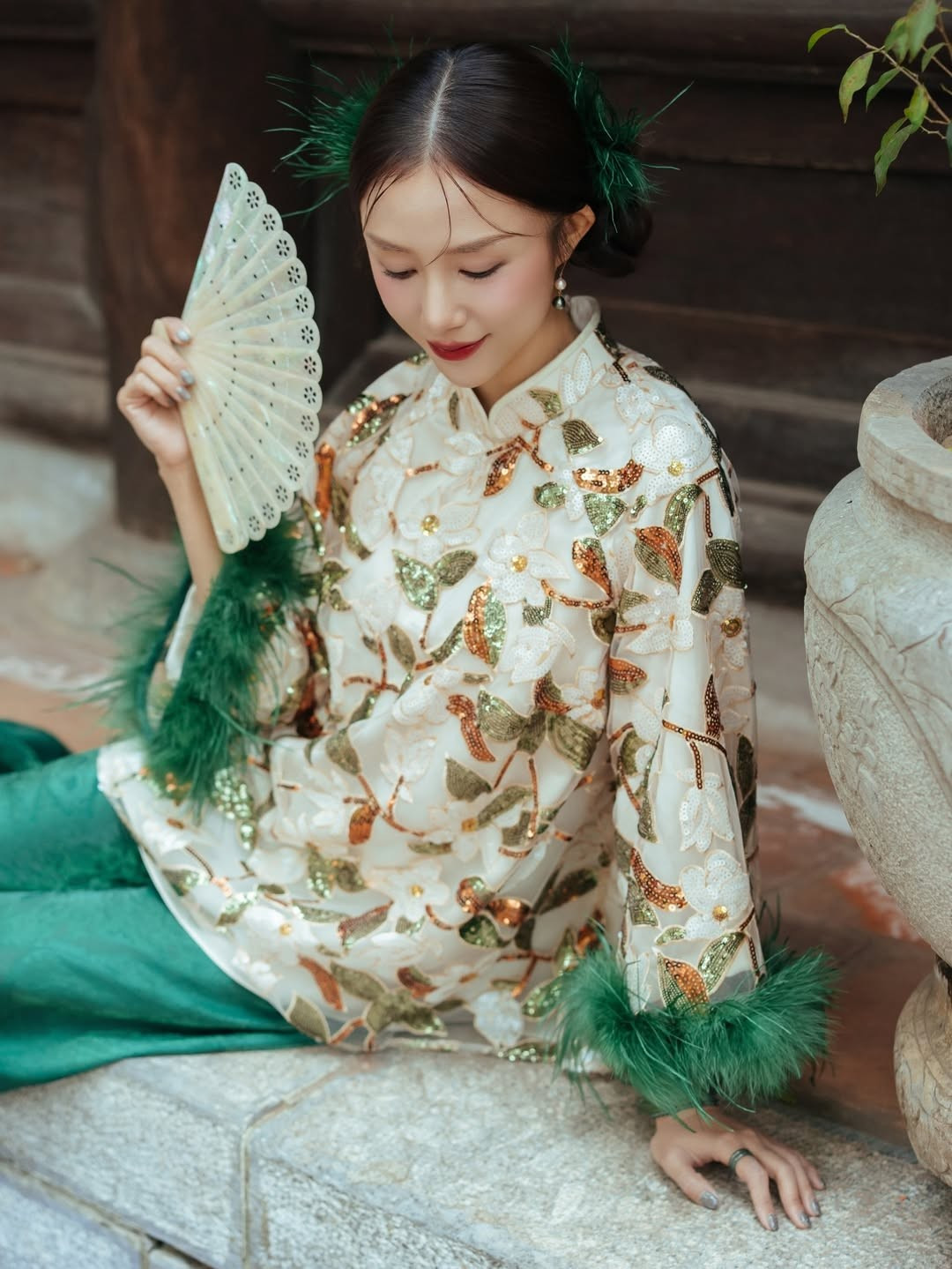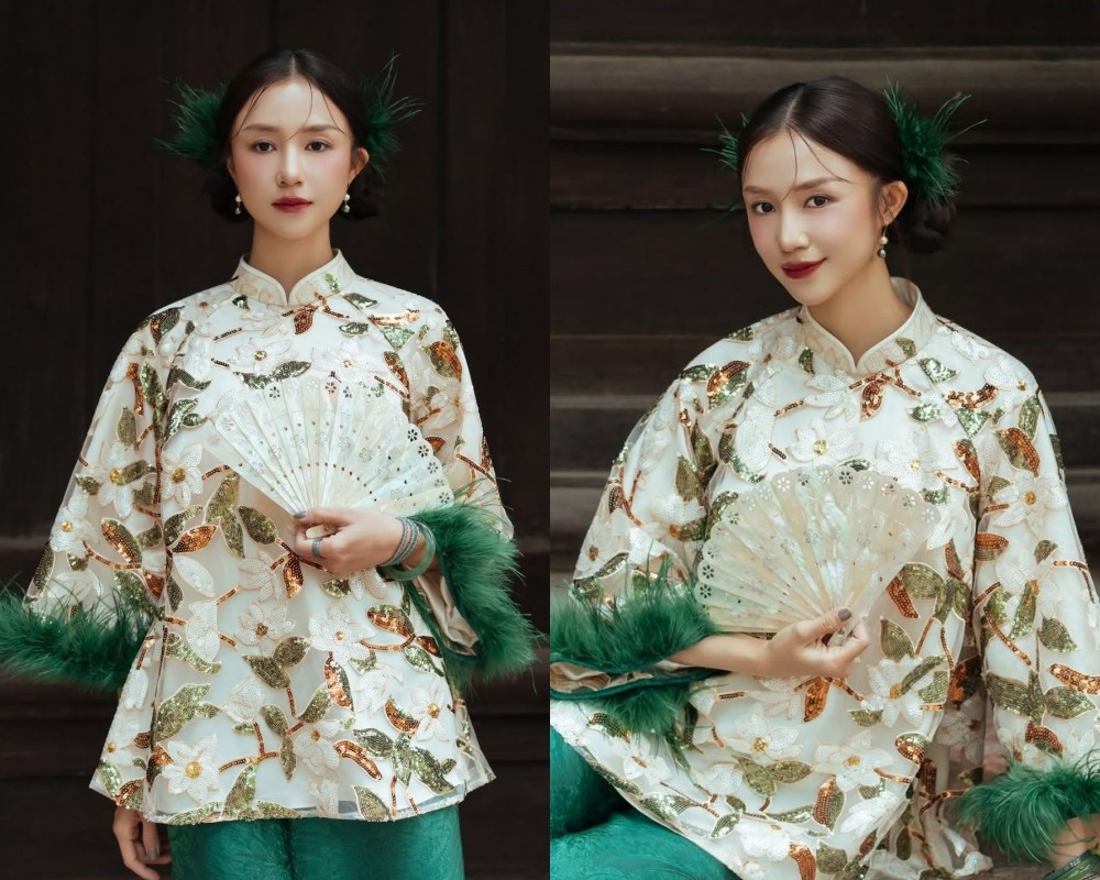 Trong bộ ảnh, Salim diện áo gấm họa tiết thêu hoa nổi, phối cùng sắc xanh ngọc và những điểm nhấn lông vũ nơi tay áo, tạo nên vẻ đẹp lộng lẫy nhưng không kém phần tinh tế. Cô khéo léo cầm quạt lụa trắng, càng làm bật lên phong thái thục nữ và sự dịu dàng rất “Salim”.