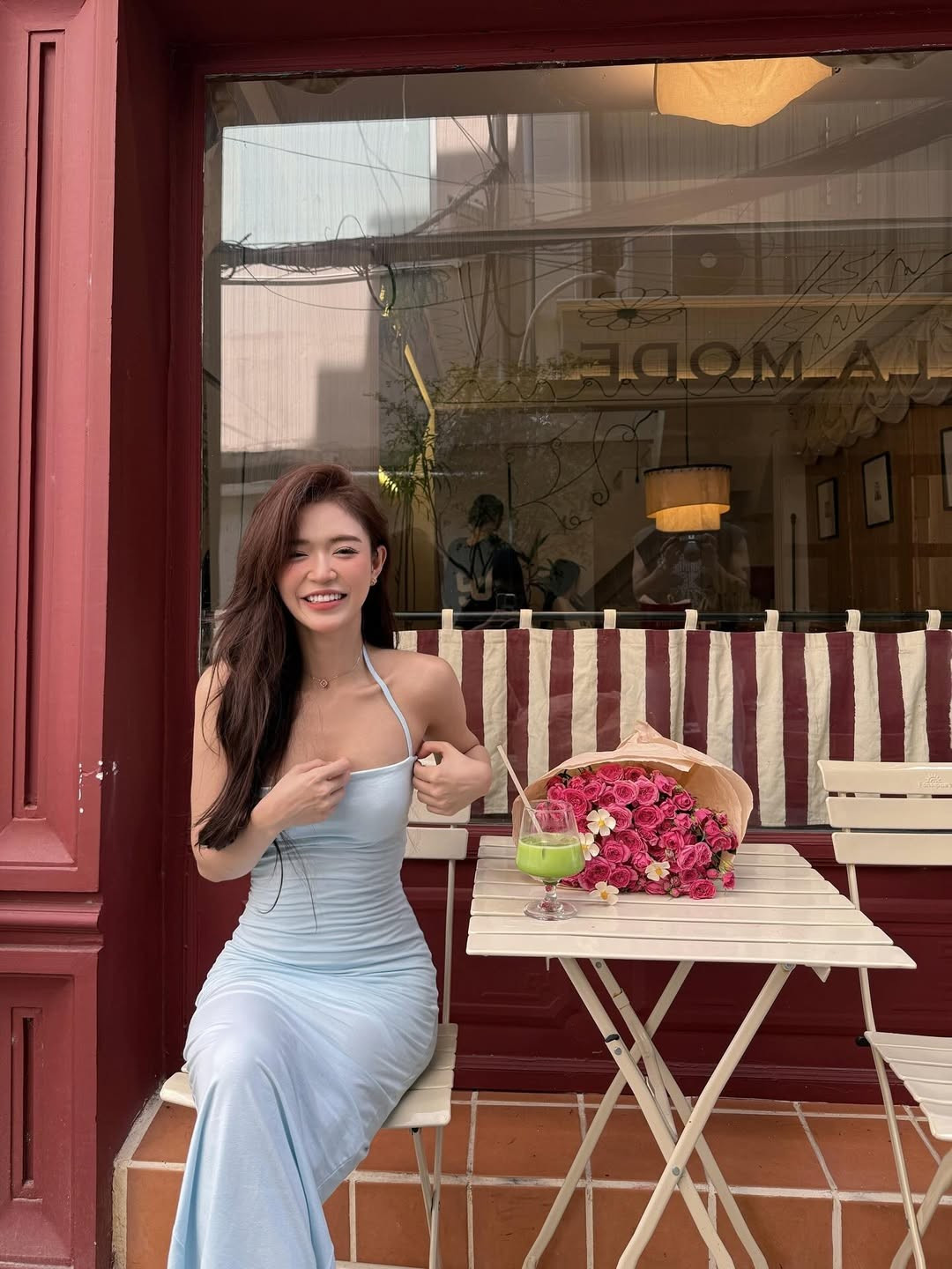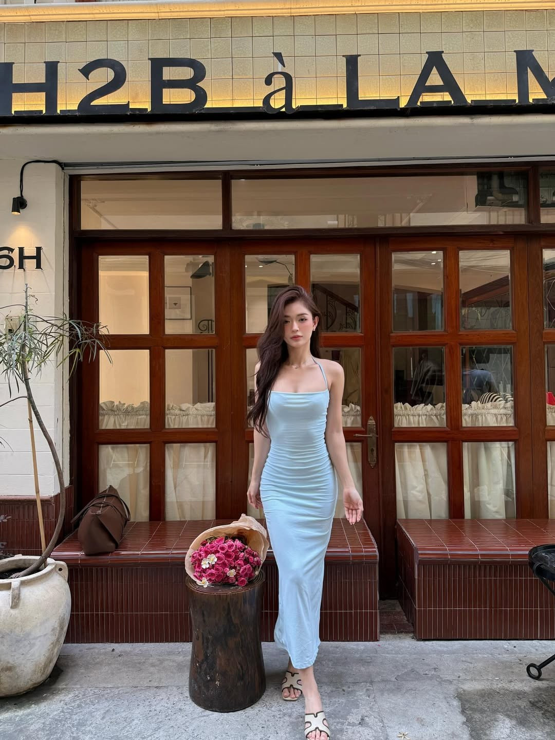 Trong loạt ảnh mới được chia sẻ, Mai Hà Hoàng Yến khiến người hâm mộ không thể rời mắt khi diện chiếc váy bodycon dài, hai dây, có màu xanh pastel nhẹ nhàng. (Ảnh: IGNV)