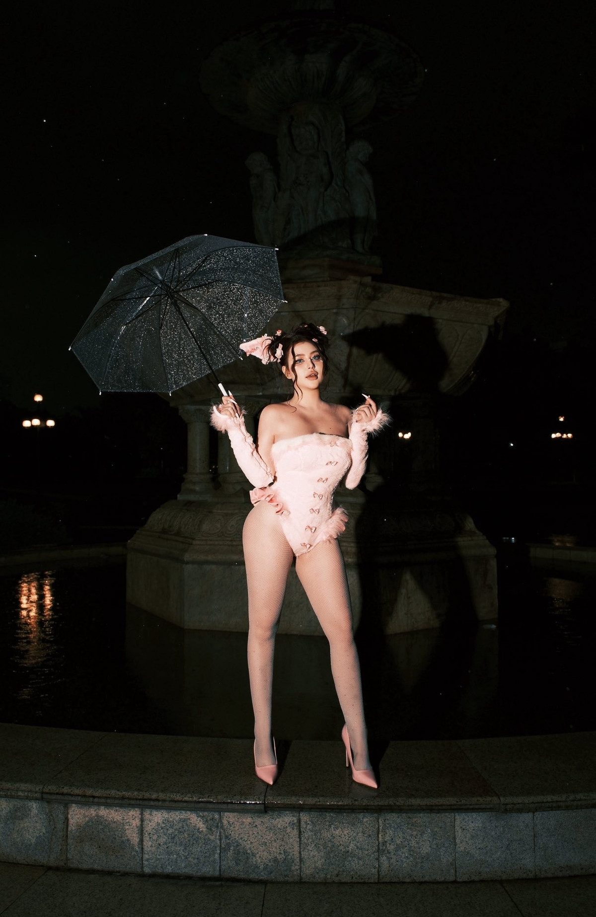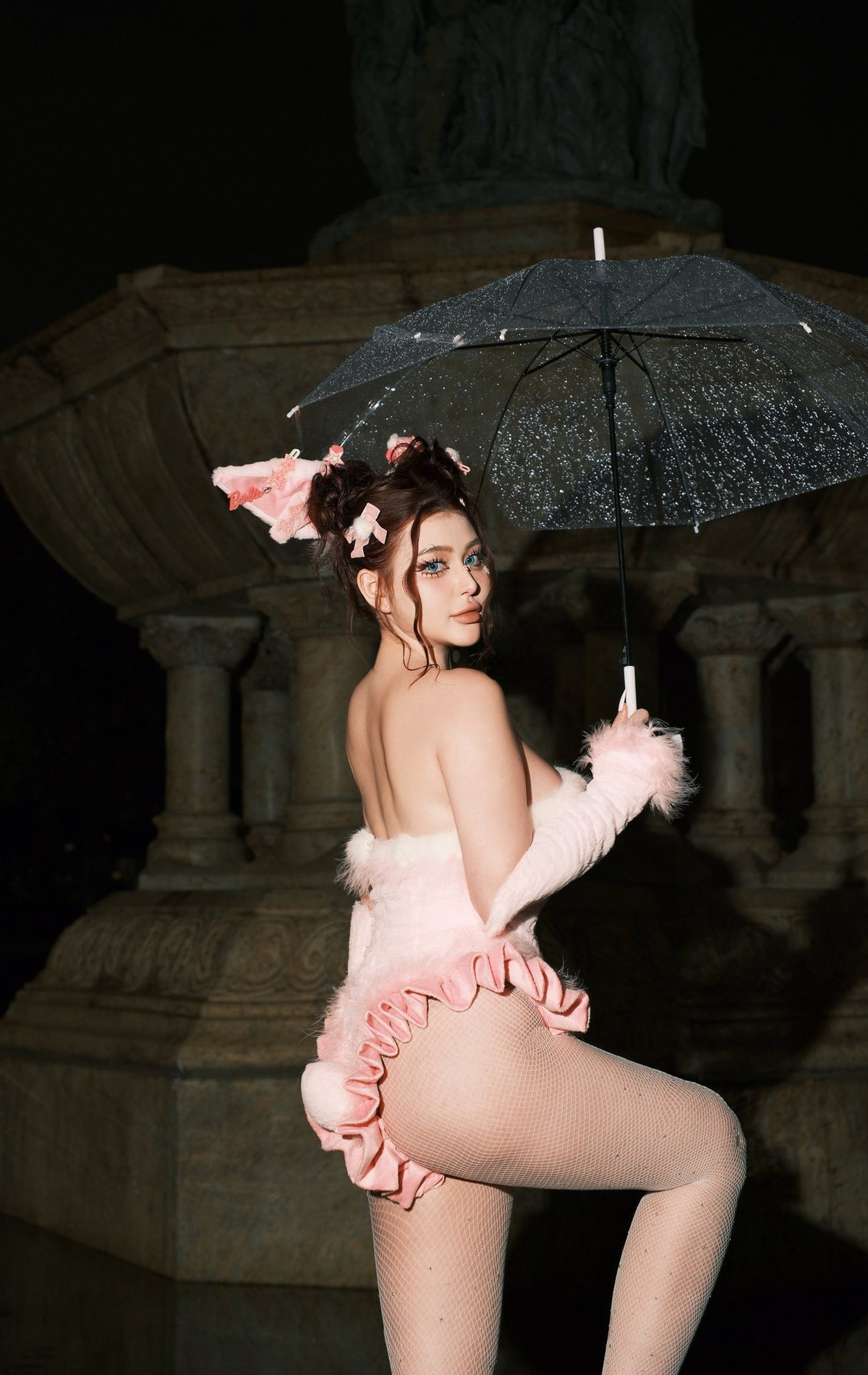 Diện bộ corset hồng pastel được thiết kế tinh tế, khoe trọn đường cong gợi cảm cùng đôi chân dài nuột nà, Sunna xuất hiện đầy nổi bật giữa khung cảnh đêm lung linh.